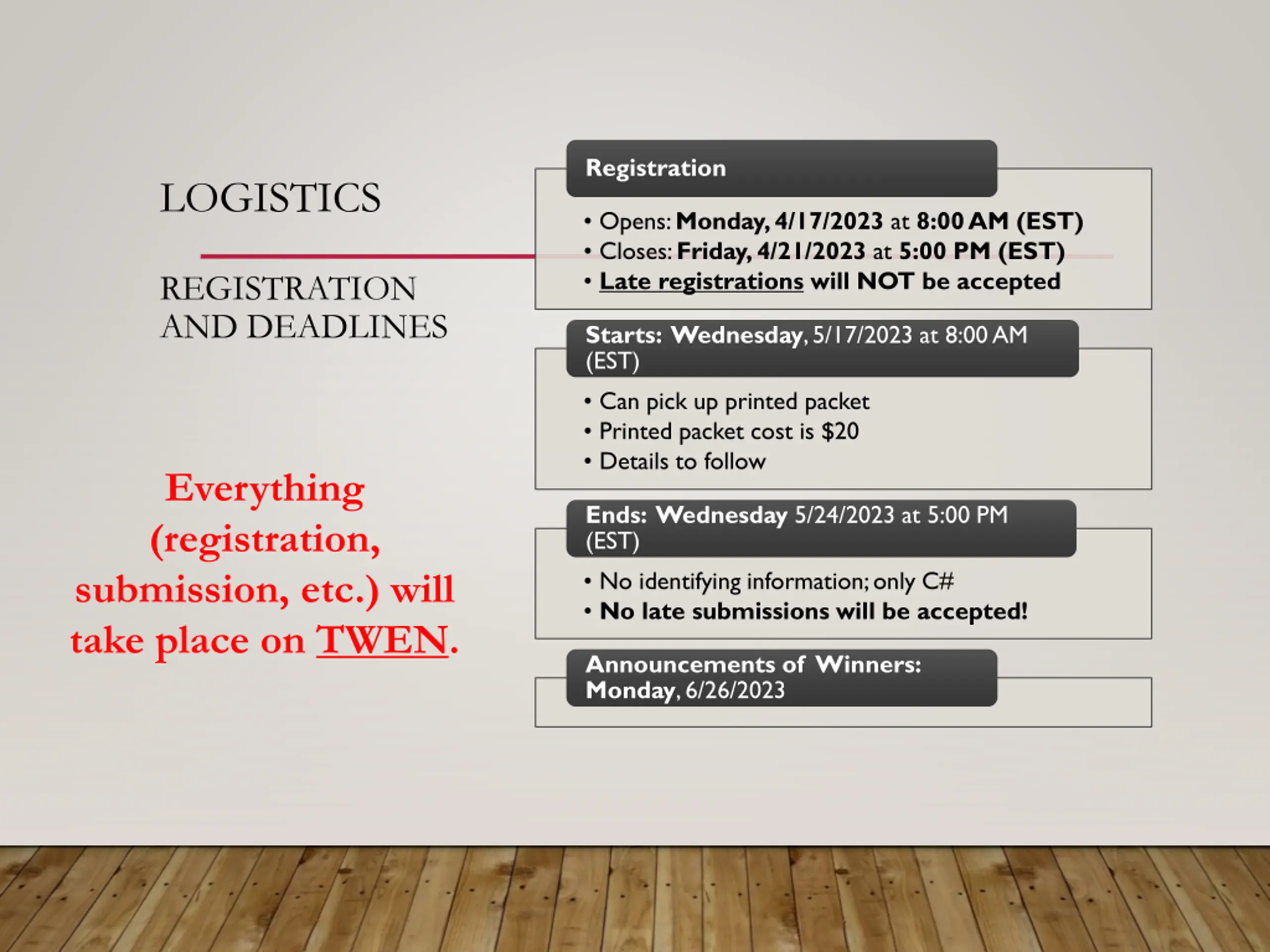 Registration LOGISTICS Opens: Monday, 4/17/2023 at 8:00 AM (EST) Closes: Friday, 4/21/2023 at 5:00 PM (EST) Late registrations will NOT be accepted REGISTRATION AND DEADLINES Starts: Wednesday, 5/17/2023 at 8:00 AM (EST) Can pick up printed packet Printed packet cost is $20 Details to follow Everything (registration, submission, etc.) will take place on TWEN. Ends: Wednesday 5/24/2023 at 5:00 PM (EST) No identifying information; only C# No late submissions will be accepted! Announcements of Winners: Monday, 6/26/2023