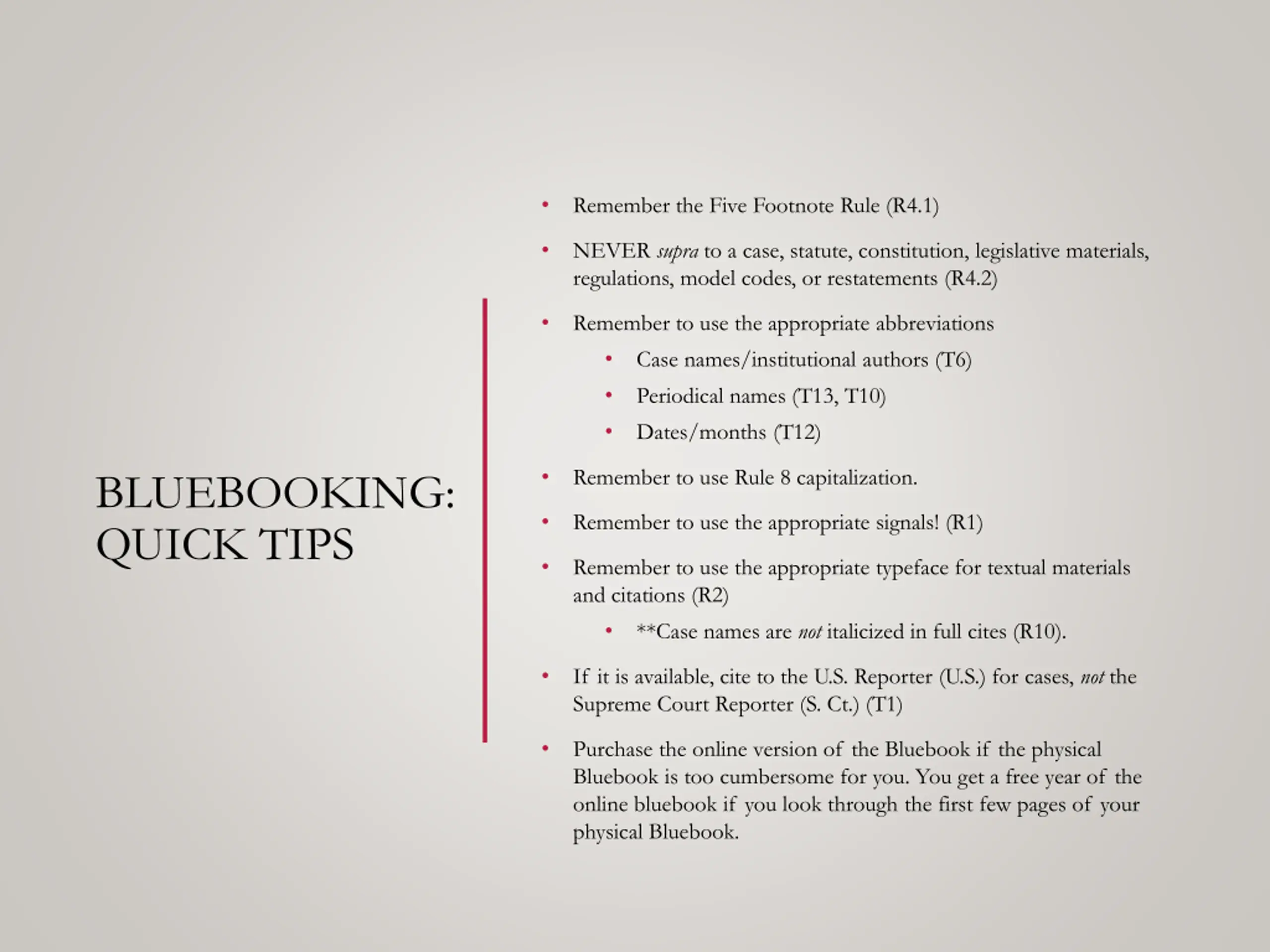 Remember the Five Footnote Rule (R4.1) NEVER supra to a case, statute, constitution, legislative materials, regulations, model codes, or restatements (R4.2) Remember to use the appropriate abbreviations Case names/institutional authors (T6) Periodical names (T13, T10) Dates/months (T12) Remember to use Rule 8 capitalization. BLUEBOOKING: QUICK TIPS Remember to use the appropriate signals! (R1) Remember to use the appropriate typeface for textual materials and citations (R2) **Case names are not italicized in full cites (R10). If it is available, cite to the U.S. Reporter (U.S.) for cases, not the Supreme Court Reporter (S. Ct.) (T1) Purchase the online version of the Bluebook if the physical Bluebook is too cumbersome for you. You get a free year of the online bluebook if you look through the first few pages of your physical Bluebook.