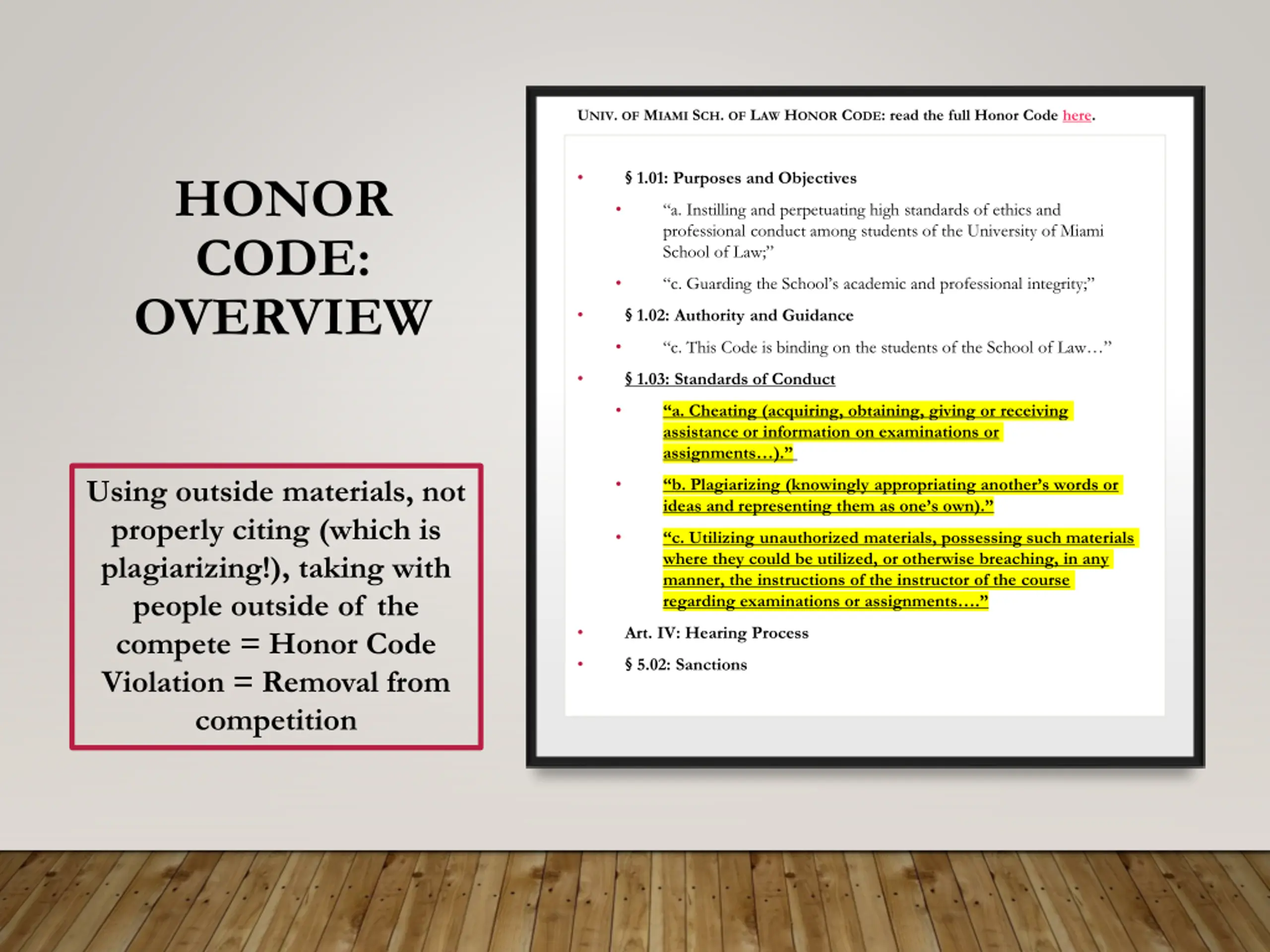 UNIV. OF MIAMI SCH. OF LAW HONOR CODE: read the full Honor Code here. 1.01: Purposes and Objectives HONOR CODE: OVERVIEW a. Instilling and perpetuating high standards of ethics and professional conduct among students of the University of Miami School of Law; c. Guarding the School s academic and professional integrity; 1.02: Authority and Guidance c. This Code is binding on the students of the School of Law 1.03: Standards of Conduct a. Cheating (acquiring, obtaining, giving or receiving assistance or information on examinations or assignments ). Using outside materials, not properly citing (which is plagiarizing!), taking with people outside of the compete = Honor Code Violation = Removal from competition b. Plagiarizing (knowingly appropriating another s words or ideas and representing them as one s own). c. Utilizing unauthorized materials, possessing such materials where they could be utilized, or otherwise breaching, in any manner, the instructions of the instructor of the course regarding examinations or assignments . Art. IV: Hearing Process 5.02: Sanctions