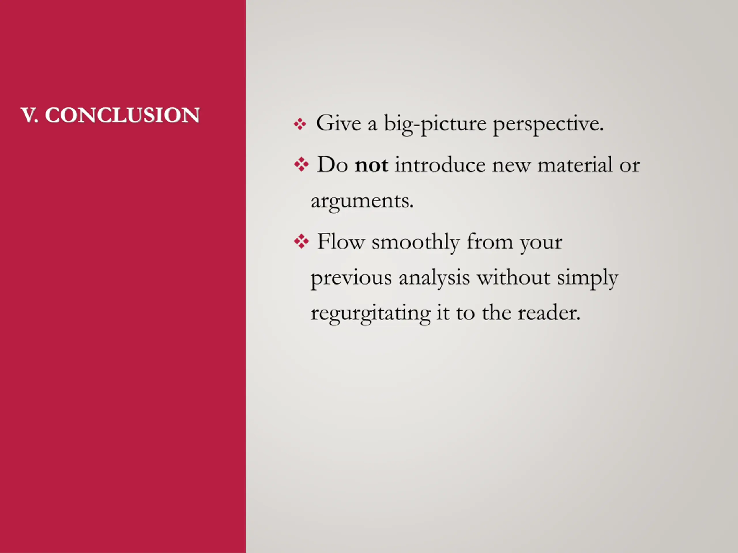 V. CONCLUSION Give a big-picture perspective. Do not introduce new material or arguments. Flow smoothly from your previous analysis without simply regurgitating it to the reader.