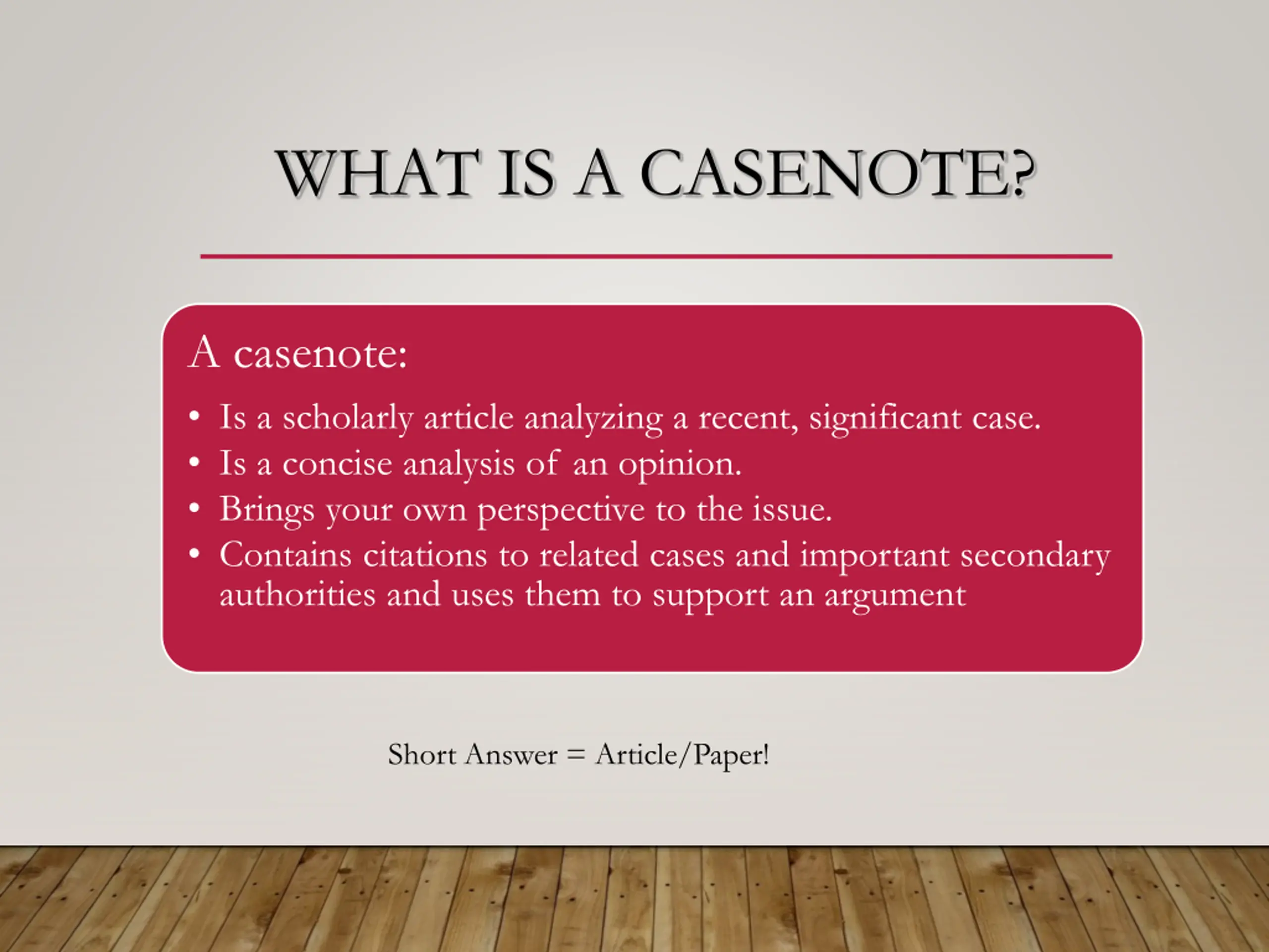WHAT IS A CASENOTE? A casenote: Is a scholarly article analyzing a recent, significant case. Is a concise analysis of an opinion. Brings your own perspective to the issue. Contains citations to related cases and important secondary authorities and uses them to support an argument Short Answer = Article/Paper!