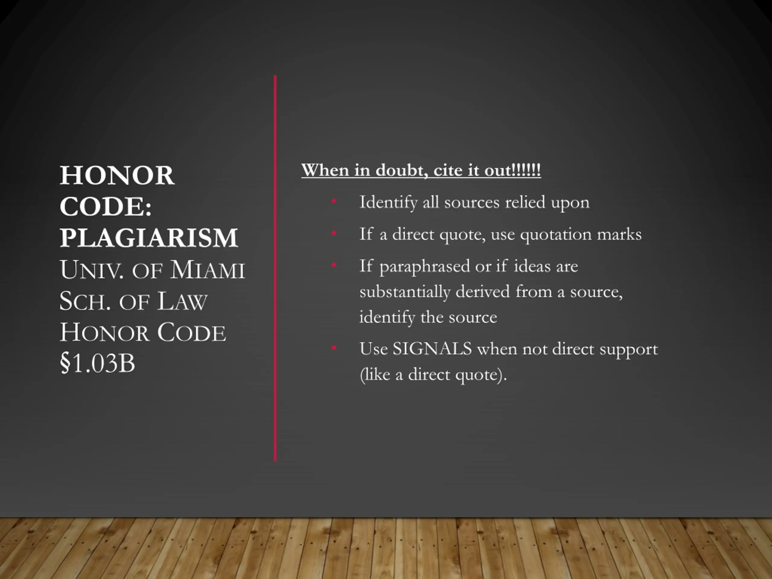 When in doubt, cite it out!!!!!! Identify all sources relied upon If a direct quote, use quotation marks If paraphrased or if ideas are substantially derived from a source, identify the source Use SIGNALS when not direct support (like a direct quote). HONOR CODE: PLAGIARISM UNIV. OF MIAMI SCH. OF LAW HONOR CODE 1.03B