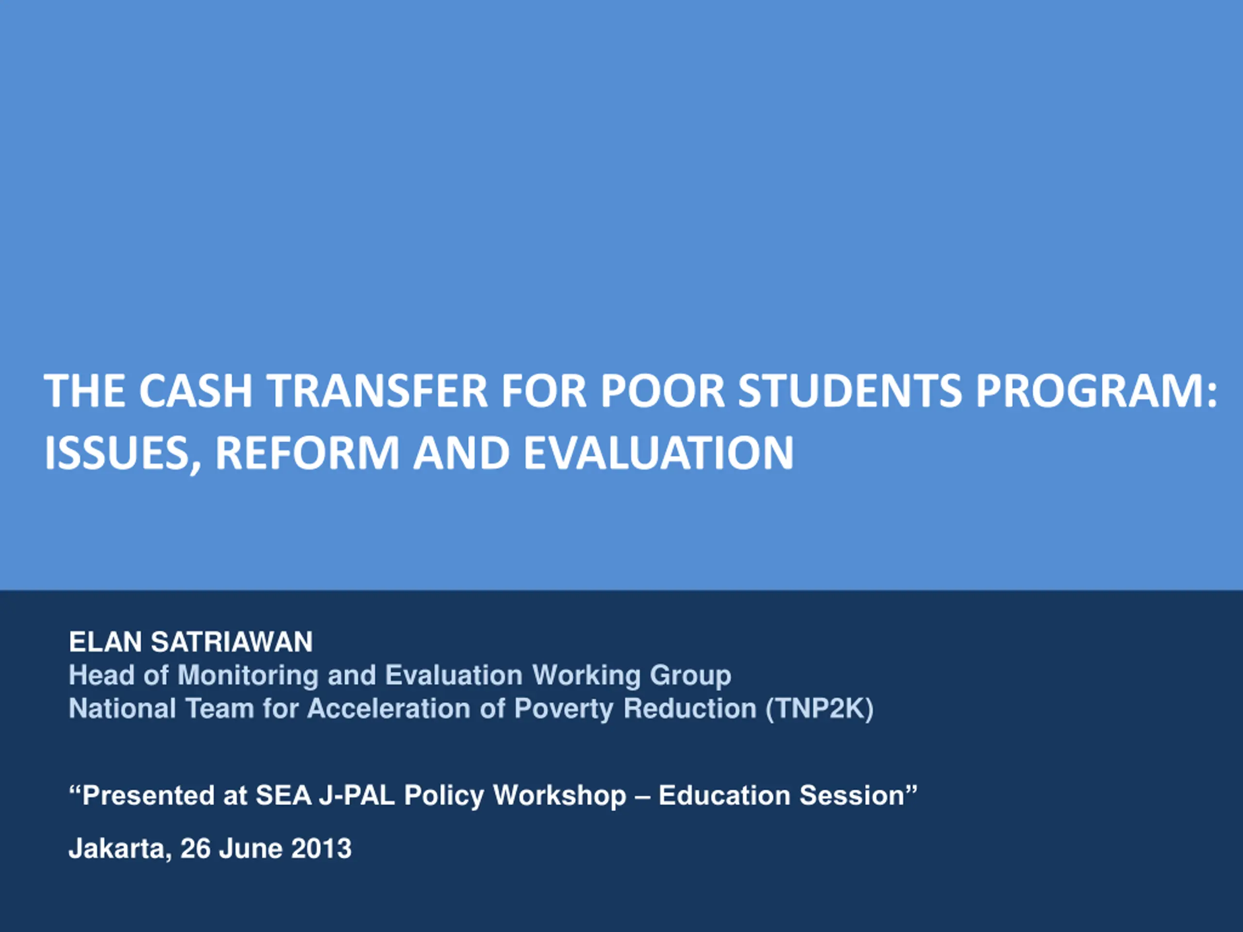 THE CASH TRANSFER FOR POOR STUDENTS PROGRAM: ISSUES, REFORM AND EVALUATION ELAN SATRIAWAN Head of Monitoring and Evaluation Working Group National Team for Acceleration of Poverty Reduction (TNP2K) Presented at SEA J-PAL Policy Workshop Education Session Jakarta, 26 June 2013 NATIONAL TEAM FOR THE ACCELERATION OF POVERTY REDUCTION