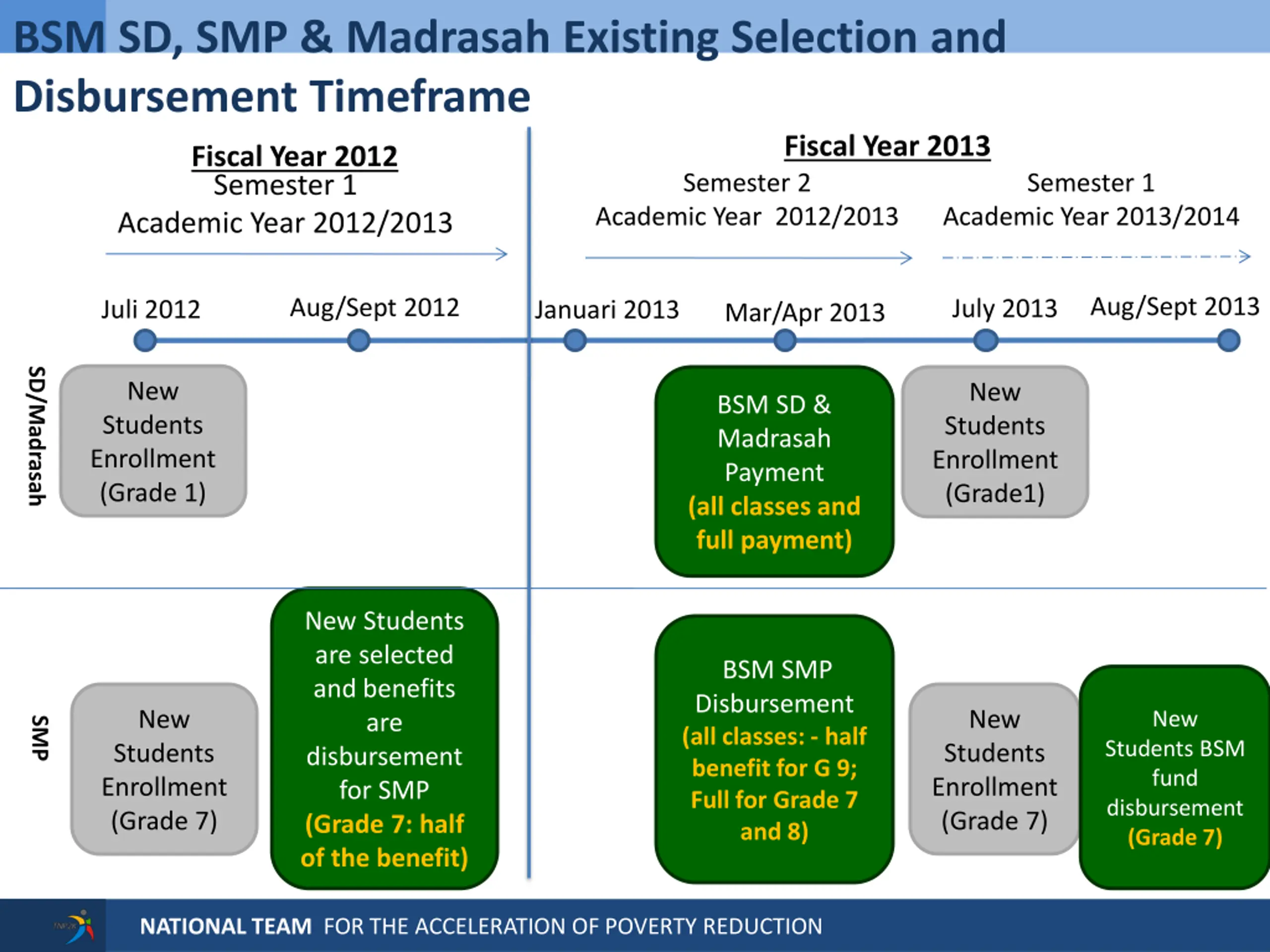 BSM SD, SMP & Madrasah Existing Selection and Disbursement Timeframe Fiscal Year 2013 Fiscal Year 2012 Semester 2 Semester 1 Semester 1 Academic Year 2012/2013 Academic Year 2013/2014 Academic Year 2012/2013 Aug/Sept 2013 Aug/Sept 2012 July 2013 Juli 2012 Januari 2013 Mar/Apr 2013 SD/Madrasah New Students Enrollment (Grade 1) New Students Enrollment (Grade1) BSM SD & Madrasah Payment (all classes and full payment) New Students are selected and benefits are disbursement for SMP (Grade 7: half of the benefit) BSM SMP Disbursement (all classes: - half benefit for G 9; Full for Grade 7 and 8) New Students Enrollment (Grade 7) New Students Enrollment (Grade 7) New SMP Students BSM fund disbursement (Grade 7) NATIONAL TEAM FOR THE ACCELERATION OF POVERTY REDUCTION