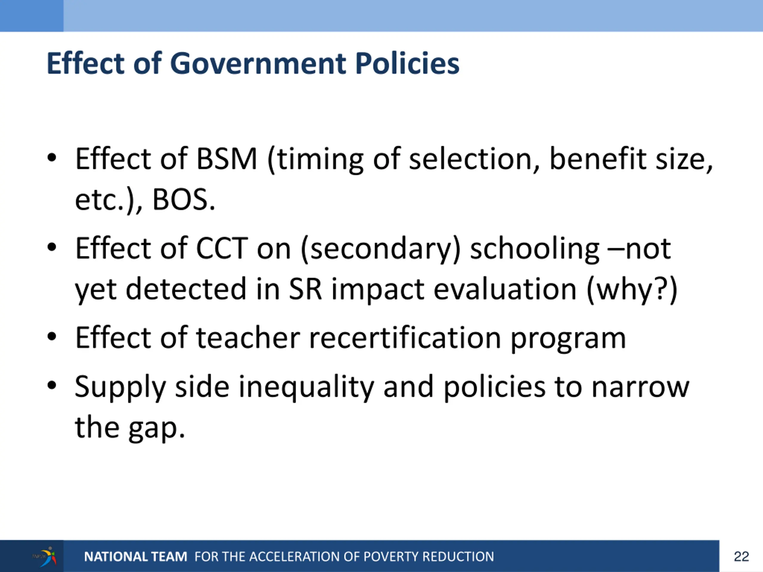 Effect of Government Policies Effect of BSM (timing of selection, benefit size, etc.), BOS. Effect of CCT on (secondary) schooling not yet detected in SR impact evaluation (why?) Effect of teacher recertification program Supply side inequality and policies to narrow the gap. 22 NATIONAL TEAM FOR THE ACCELERATION OF POVERTY REDUCTION