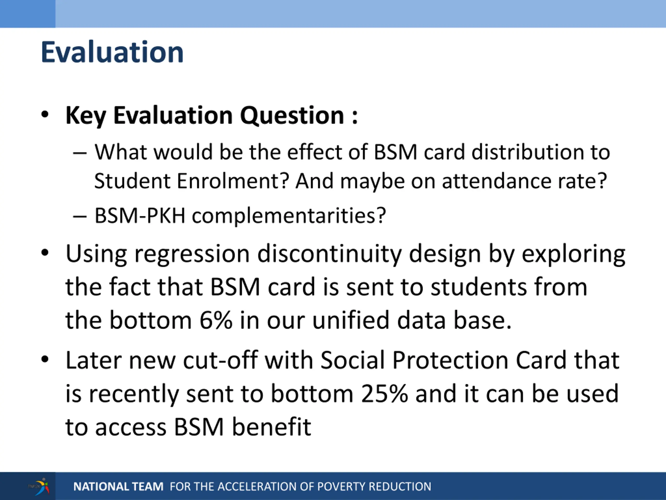 Evaluation Key Evaluation Question : What would be the effect of BSM card distribution to Student Enrolment? And maybe on attendance rate? BSM-PKH complementarities? Using regression discontinuity design by exploring the fact that BSM card is sent to students from the bottom 6% in our unified data base. Later new cut-off with Social Protection Card that is recently sent to bottom 25% and it can be used to access BSM benefit NATIONAL TEAM FOR THE ACCELERATION OF POVERTY REDUCTION