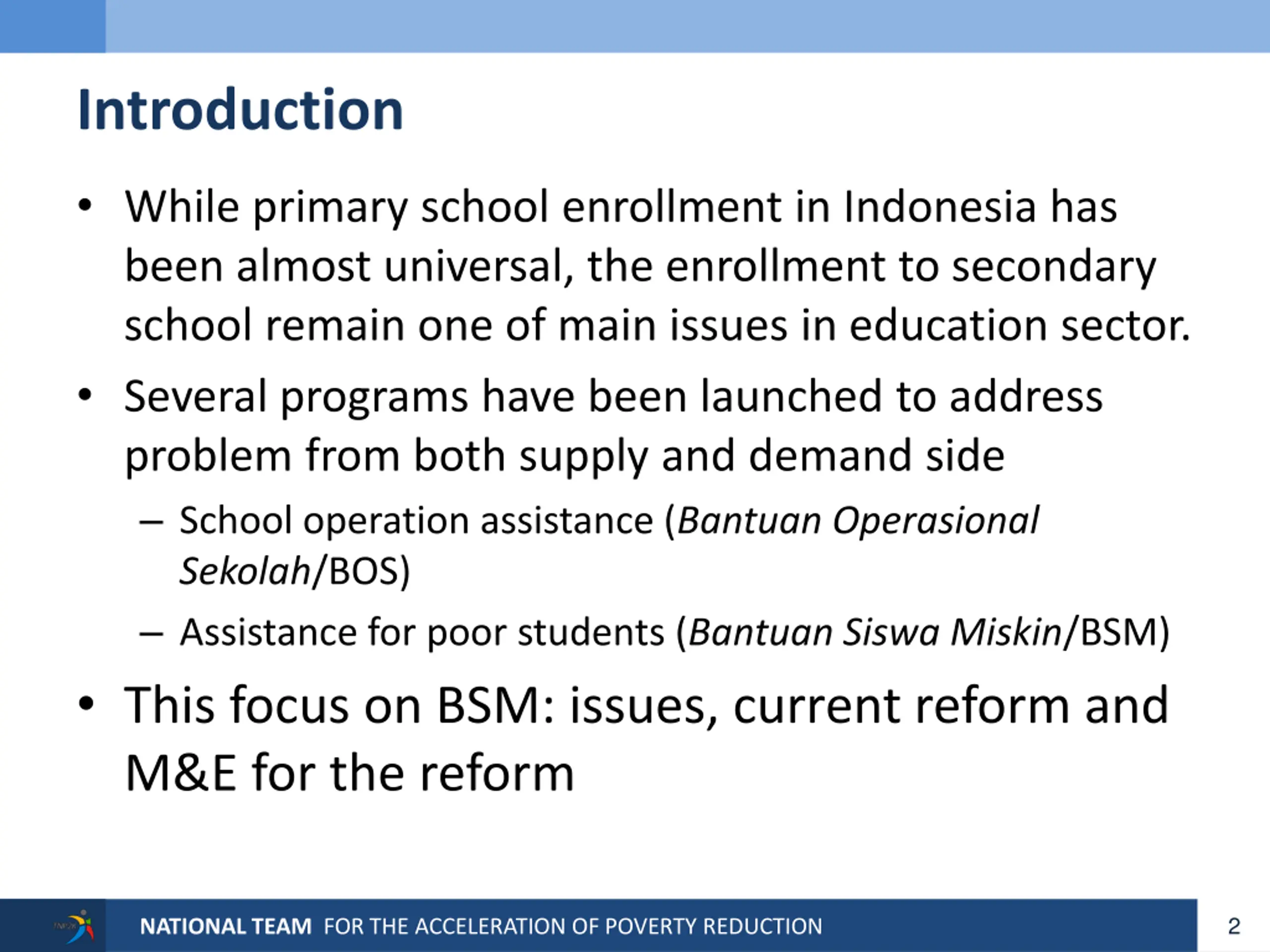 Introduction While primary school enrollment in Indonesia has been almost universal, the enrollment to secondary school remain one of main issues in education sector. Several programs have been launched to address problem from both supply and demand side School operation assistance (Bantuan Operasional Sekolah/BOS) Assistance for poor students (Bantuan Siswa Miskin/BSM) This focus on BSM: issues, current reform and M&E for the reform 2 NATIONAL TEAM FOR THE ACCELERATION OF POVERTY REDUCTION