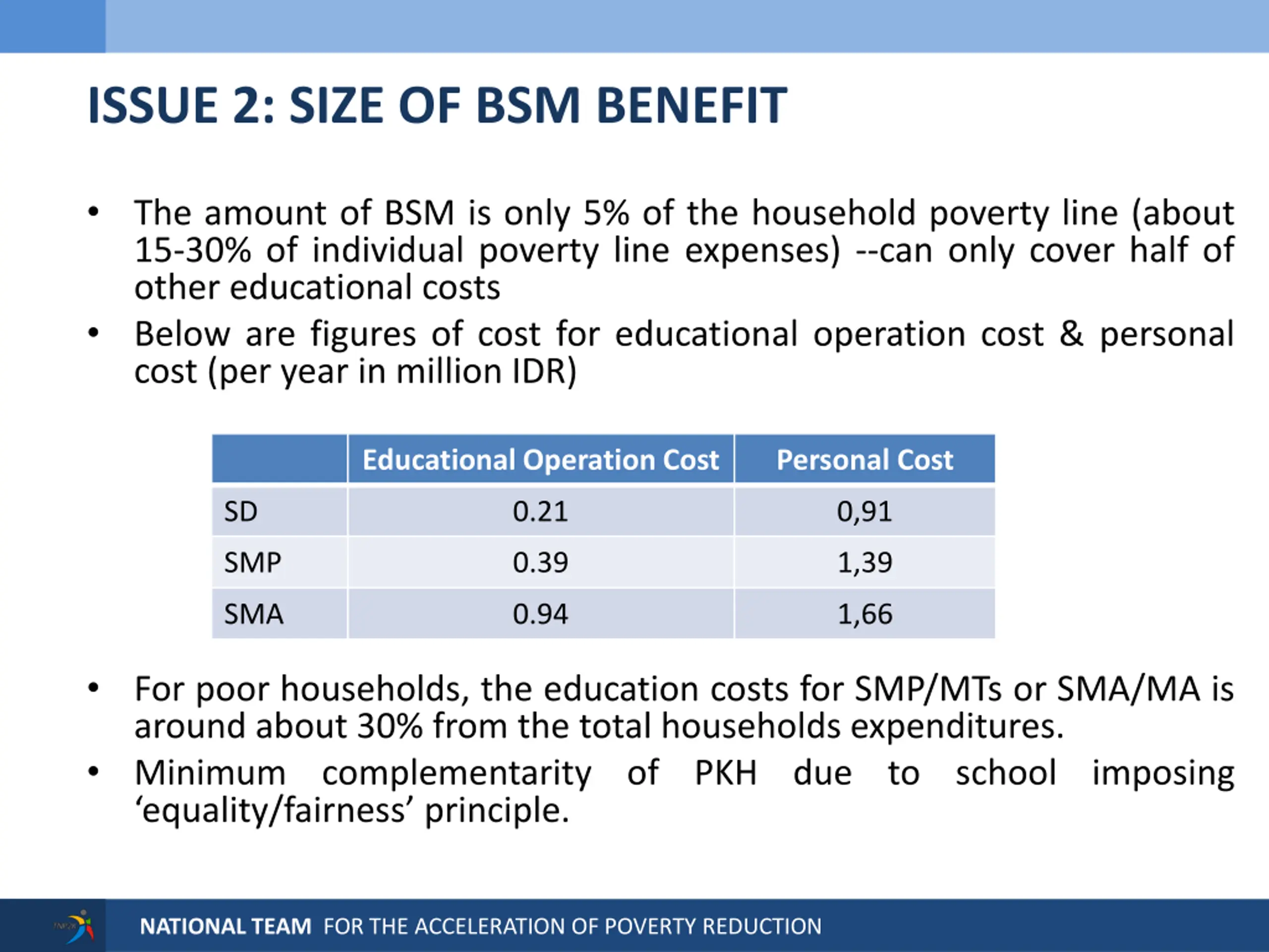 ISSUE 2: SIZE OF BSM BENEFIT The amount of BSM is only 5% of the household poverty line (about 15-30% of individual poverty line expenses) --can only cover half of other educational costs Below are figures of cost for educational operation cost & personal cost (per year in million IDR) Educational Operation Cost Personal Cost SD 0.21 0,91 SMP 0.39 1,39 SMA 0.94 1,66 For poor households, the education costs for SMP/MTs or SMA/MA is around about 30% from the total households expenditures. Minimum complementarity of PKH due to school imposing equality/fairness principle. NATIONAL TEAM FOR THE ACCELERATION OF POVERTY REDUCTION