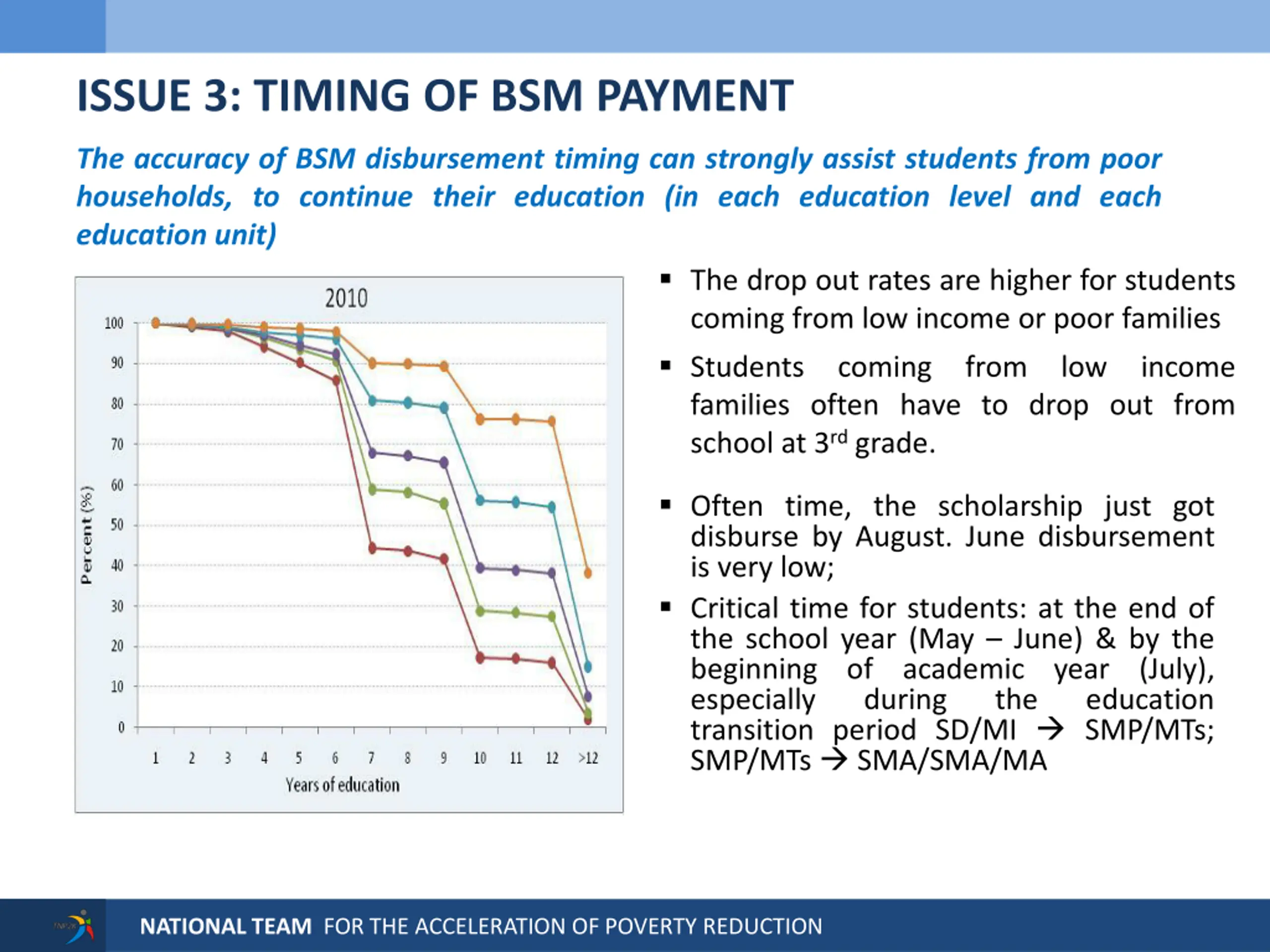 ISSUE 3: TIMING OF BSM PAYMENT The accuracy of BSM disbursement timing can strongly assist students from poor households, to continue their education (in each education level and each education unit) The drop out rates are higher for students coming from low income or poor families Students coming from low income families often have to drop out from school at 3rd grade. Often time, the scholarship just got disburse by August. June disbursement is very low; Critical time for students: at the end of the school year (May June) & by the beginning of academic year (July), especially during transition period SD/MI SMP/MTs; SMP/MTs SMA/SMA/MA the education NATIONAL TEAM FOR THE ACCELERATION OF POVERTY REDUCTION
