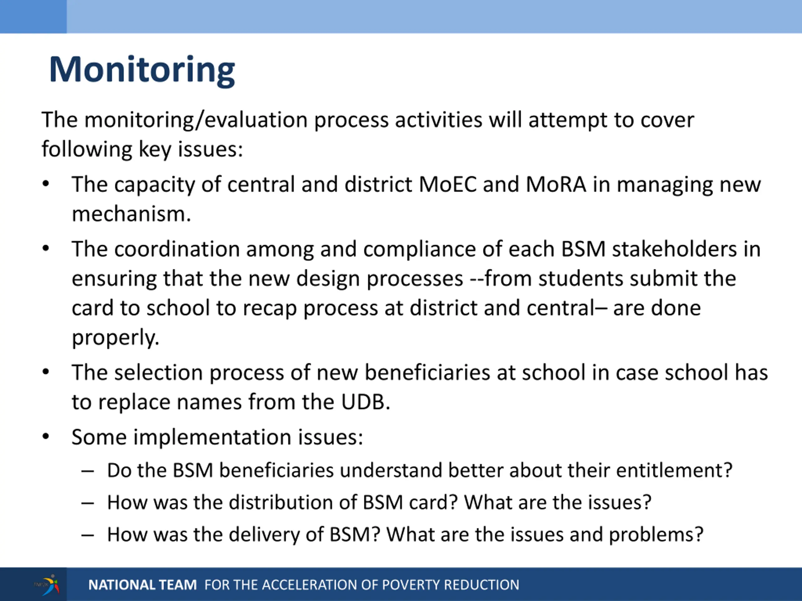 Monitoring The monitoring/evaluation process activities will attempt to cover following key issues: The capacity of central and district MoEC and MoRA in managing new mechanism. The coordination among and compliance of each BSM stakeholders in ensuring that the new design processes --from students submit the card to school to recap process at district and central are done properly. The selection process of new beneficiaries at school in case school has to replace names from the UDB. Some implementation issues: Do the BSM beneficiaries understand better about their entitlement? How was the distribution of BSM card? What are the issues? How was the delivery of BSM? What are the issues and problems? NATIONAL TEAM FOR THE ACCELERATION OF POVERTY REDUCTION