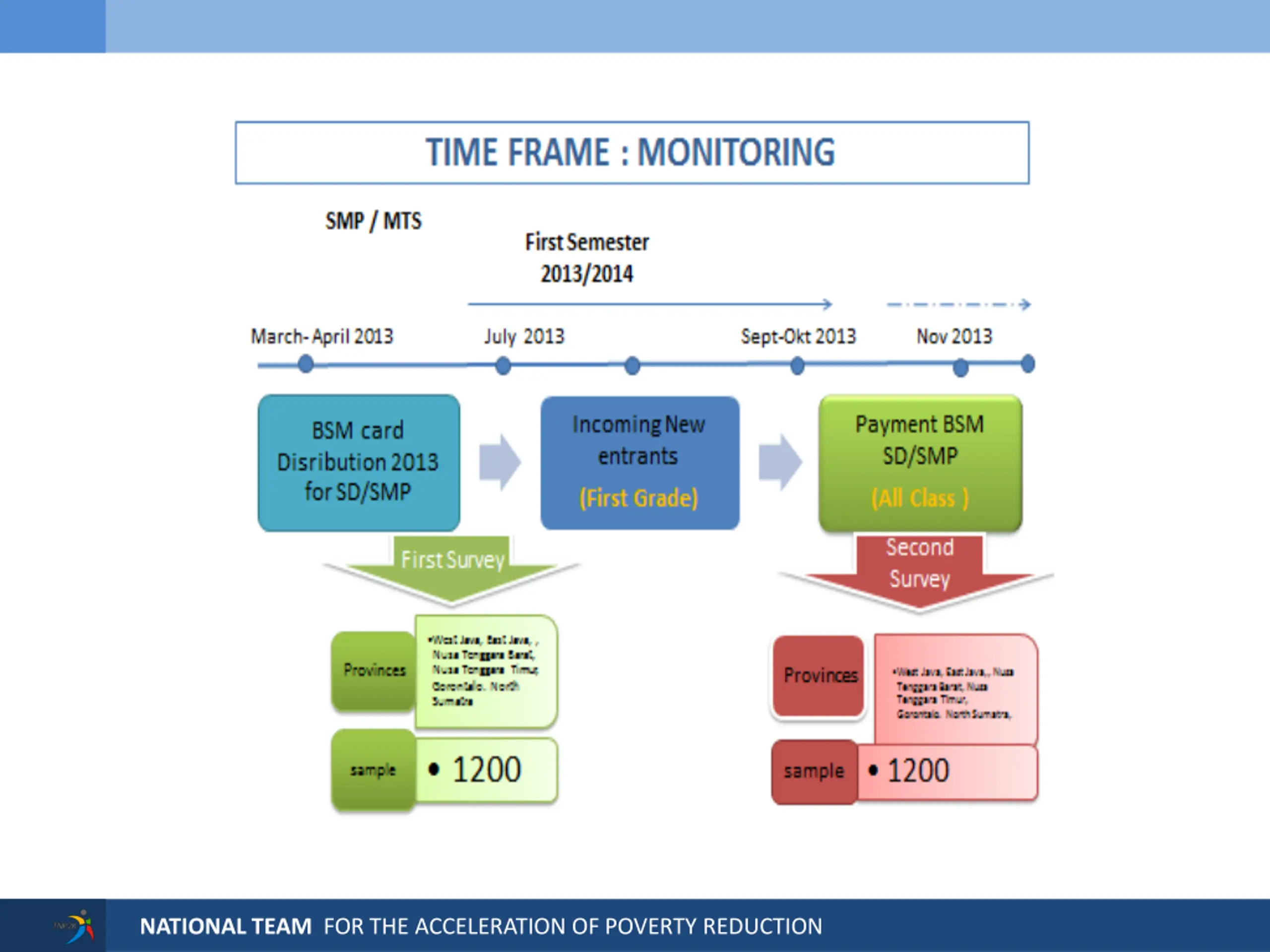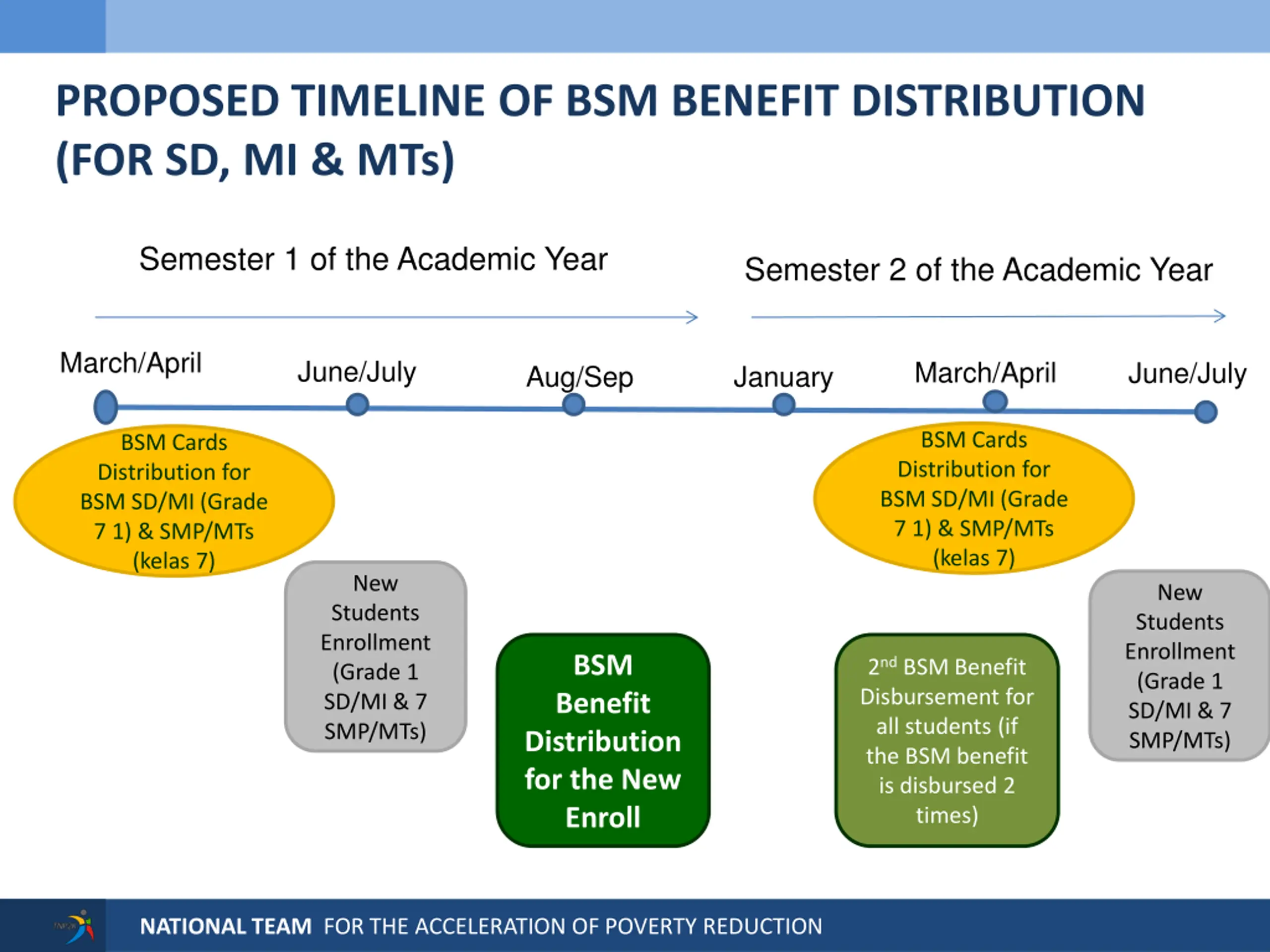 PROPOSED TIMELINE OF BSM BENEFIT DISTRIBUTION (FOR SD, MI & MTs) Semester 1 of the Academic Year Semester 2 of the Academic Year March/April June/July March/April June/July Aug/Sep January BSM Cards Distribution for BSM SD/MI (Grade 7 1) & SMP/MTs (kelas 7) BSM Cards Distribution for BSM SD/MI (Grade 7 1) & SMP/MTs (kelas 7) New Students Enrollment (Grade 1 SD/MI & 7 SMP/MTs) New Students Enrollment (Grade 1 SD/MI & 7 SMP/MTs) BSM Benefit Distribution for the New Enroll 2nd BSM Benefit Disbursement for all students (if the BSM benefit is disbursed 2 times) NATIONAL TEAM FOR THE ACCELERATION OF POVERTY REDUCTION