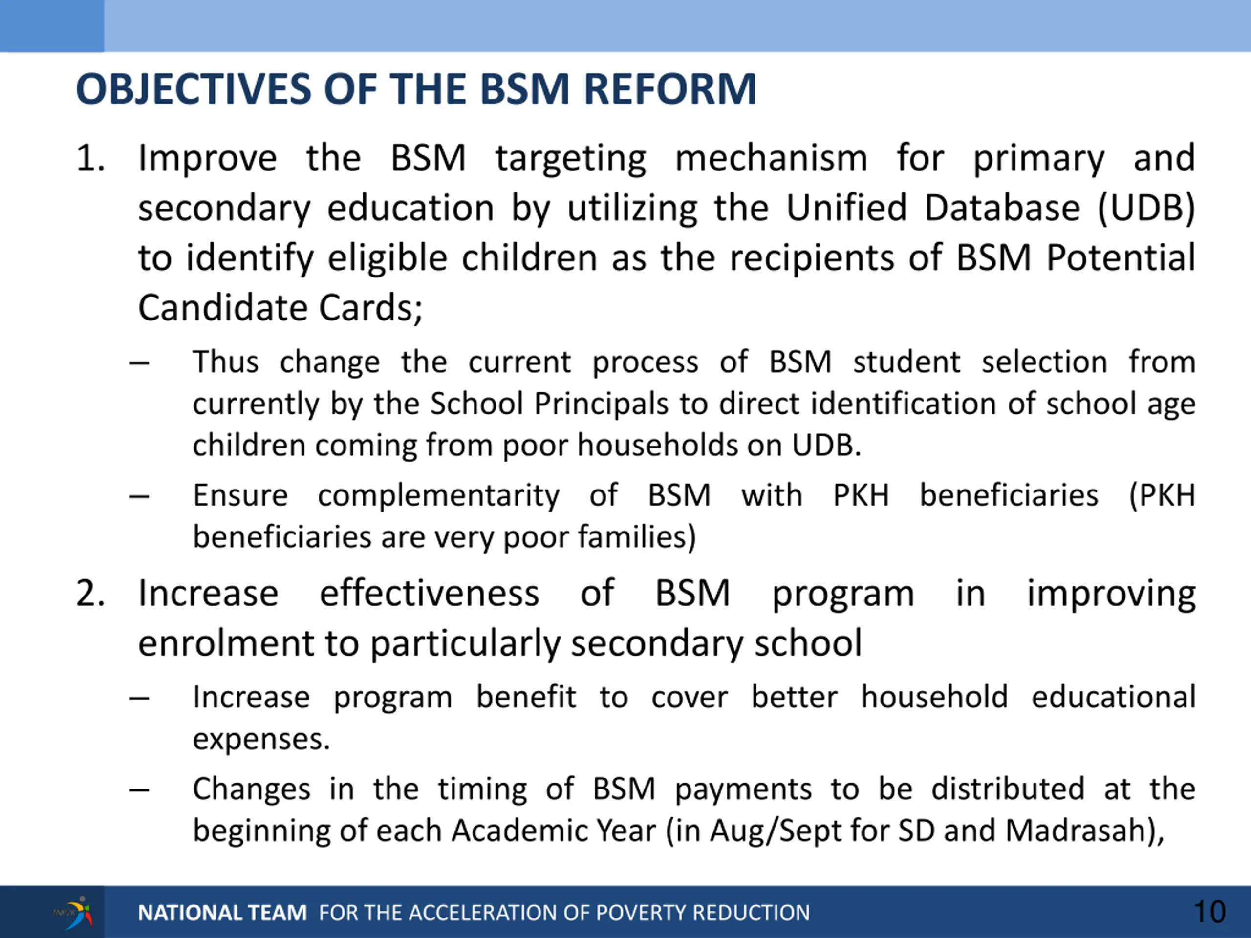 OBJECTIVES OF THE BSM REFORM 1. Improve the BSM targeting mechanism for primary and secondary education by utilizing the Unified Database (UDB) to identify eligible children as the recipients of BSM Potential Candidate Cards; Thus change the current process of BSM student selection from currently by the School Principals to direct identification of school age children coming from poor households on UDB. Ensure complementarity of BSM with PKH beneficiaries (PKH beneficiaries are very poor families) 2. Increase effectiveness of BSM program in improving enrolment to particularly secondary school Increase program benefit to cover better household educational expenses. Changes in the timing of BSM payments to be distributed at the beginning of each Academic Year (in Aug/Sept for SD and Madrasah), 10 NATIONAL TEAM FOR THE ACCELERATION OF POVERTY REDUCTION