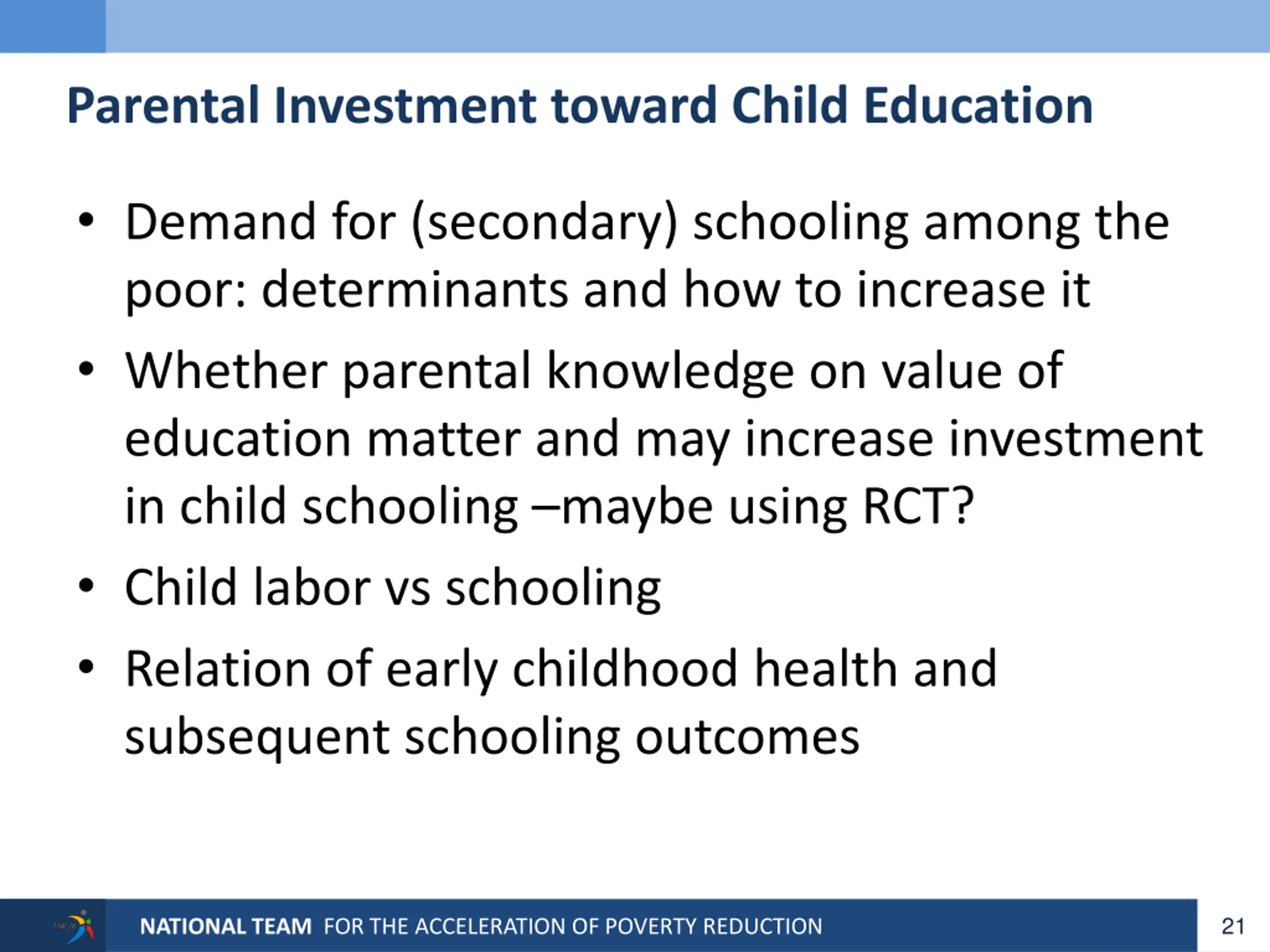 Parental Investment toward Child Education Demand for (secondary) schooling among the poor: determinants and how to increase it Whether parental knowledge on value of education matter and may increase investment in child schooling maybe using RCT? Child labor vs schooling Relation of early childhood health and subsequent schooling outcomes 21 NATIONAL TEAM FOR THE ACCELERATION OF POVERTY REDUCTION