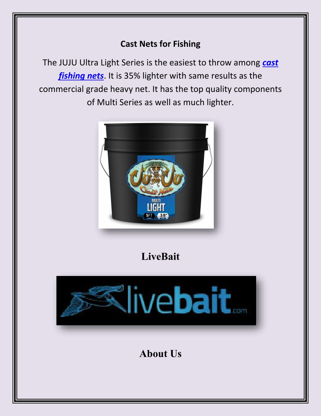 Cast Nets for Fishing The JUJU Ultra Light Series is the easiest to throw among cast fishing nets. It is 35% lighter with same results as the commercial grade heavy net. It has the top quality components of Multi Series as well as much lighter. LiveBait About Us
