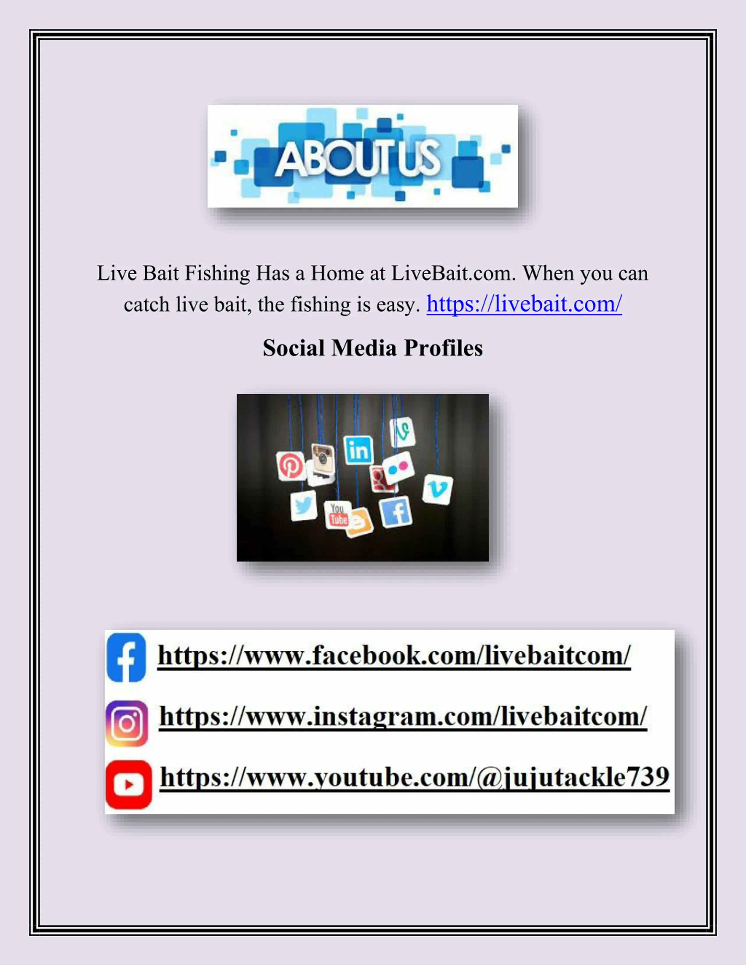 Live Bait Fishing Has a Home at LiveBait.com. When you can catch live bait, the fishing is easy. https://livebait.com/ Social Media Profiles