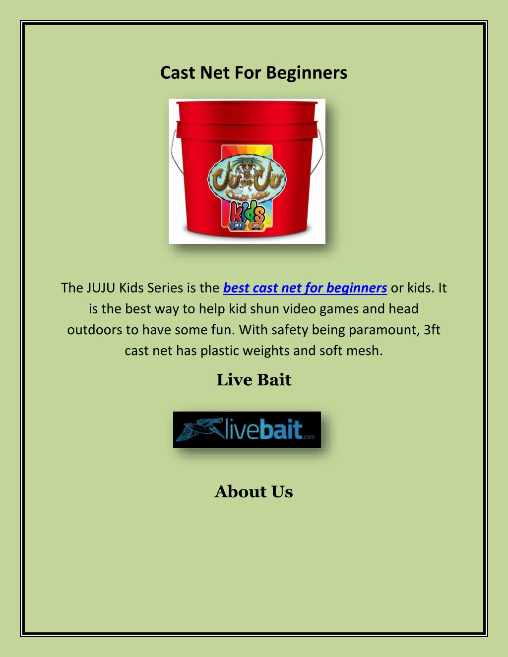 Cast Net For Beginners The JUJU Kids Series is the best cast net for beginners or kids. It is the best way to help kid shun video games and head outdoors to have some fun. With safety being paramount, 3ft cast net has plastic weights and soft mesh. Live Bait About Us
