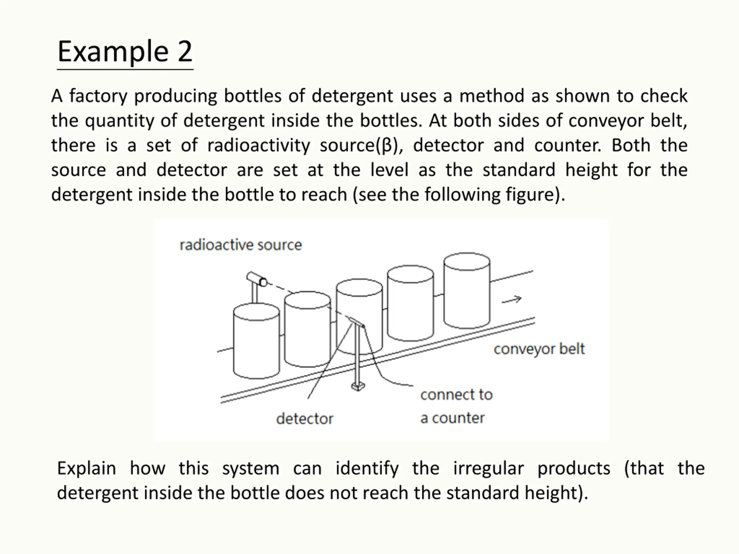 Example 2 A factory producing bottles of detergent uses a method as shown to check the quantity of detergent inside the bottles. At both sides of conveyor belt, there is a set of radioactivity source( ), detector and counter. Both the source and detector are set at the level as the standard height for the detergent inside the bottle to reach (see the following figure). Explain how this system can identify the irregular products (that the detergent inside the bottle does not reach the standard height).