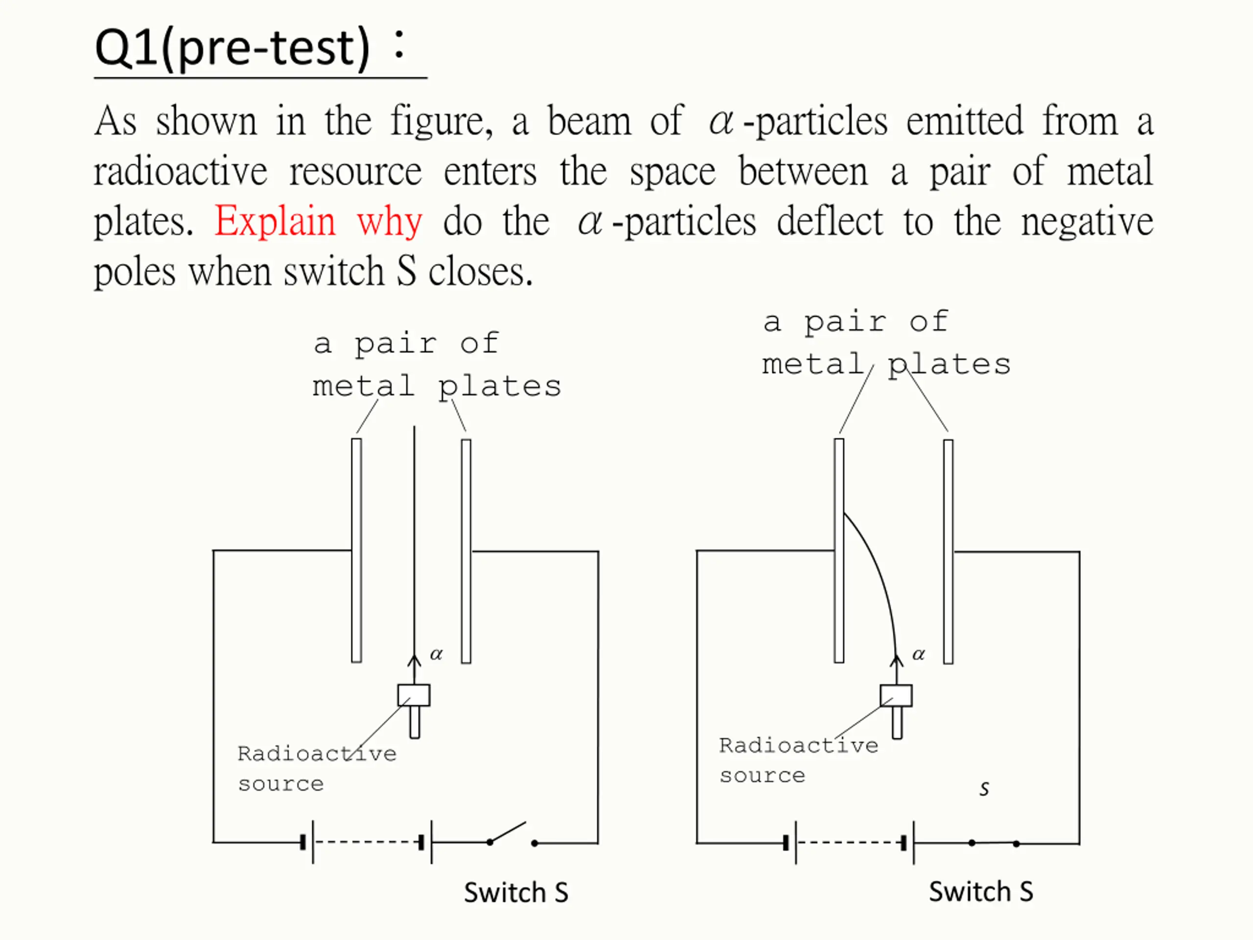 Q1(pre-test) As shown in the figure, a beam of -particles emitted from a radioactive resource enters the space between a pair of metal plates. Explain why do the -particles deflect to the negative poles when switch S closes. a pair of metal plates a pair of metal plates Radioactive source Radioactive source S Switch S Switch S