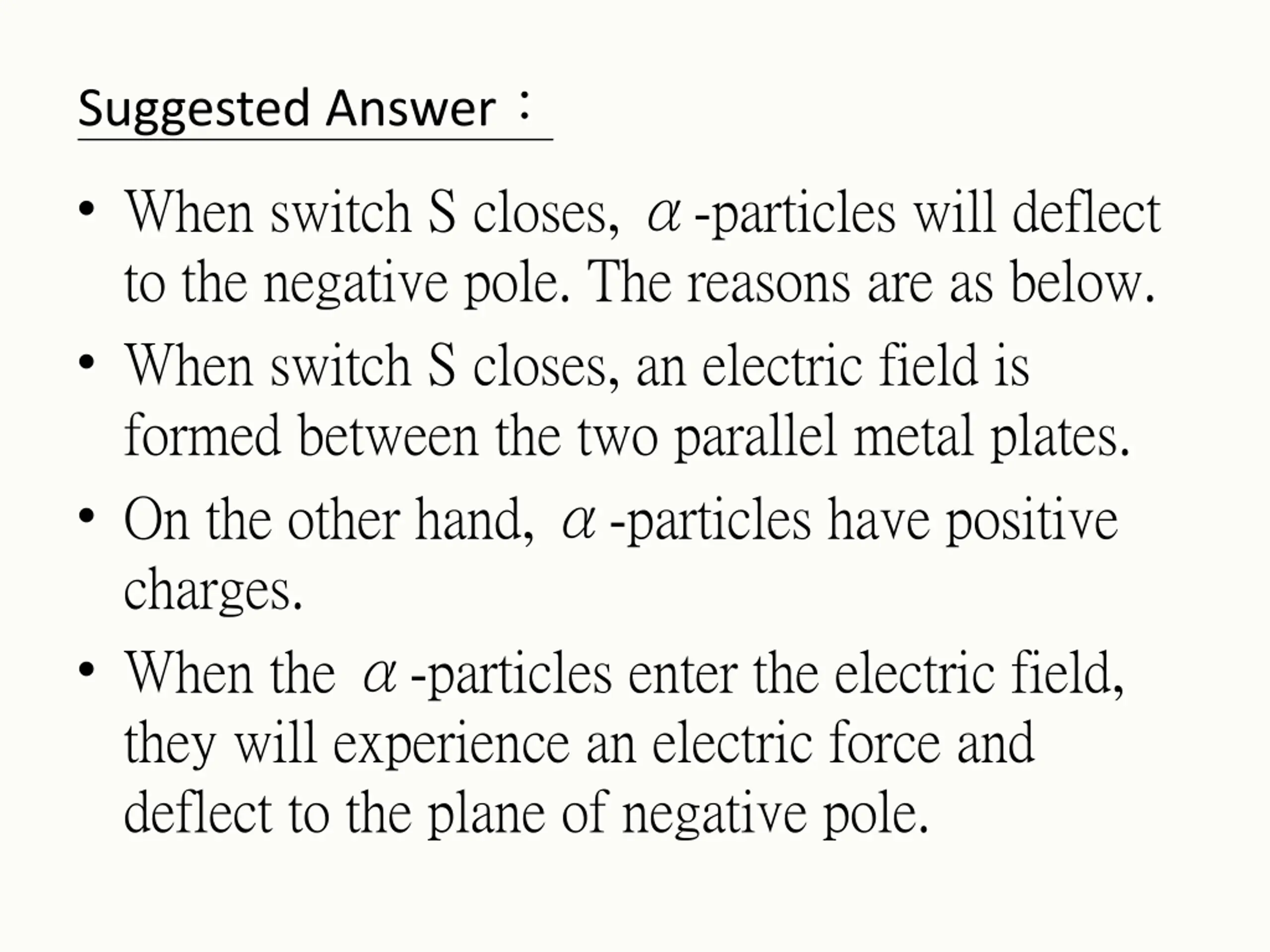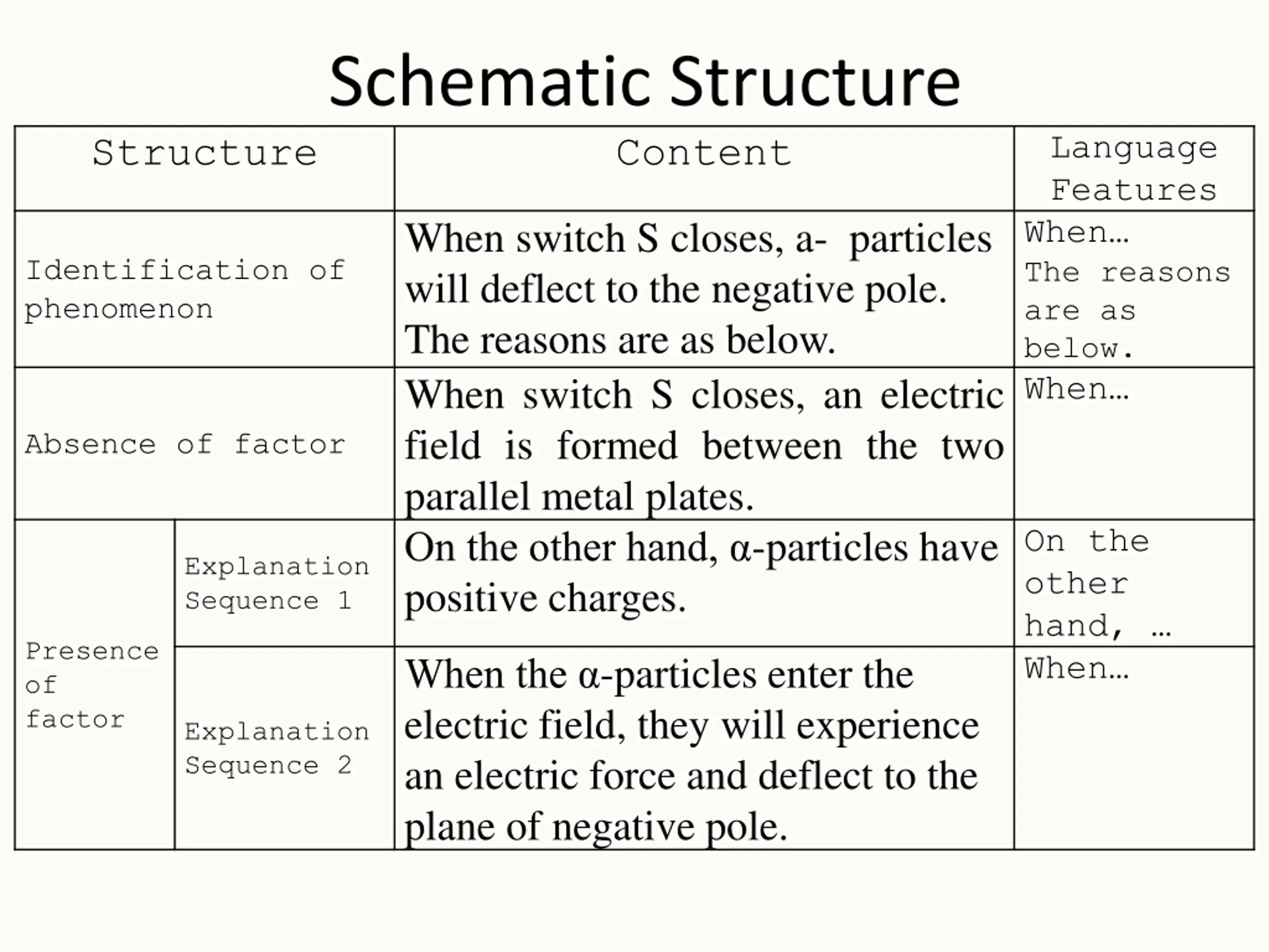 Schematic Structure Content Language Features When The reasons are as below. When Structure When switch S closes, a- particles will deflect to the negative pole. The reasons are as below. When switch S closes, an electric field is formed between the two parallel metal plates. On the other hand, -particles have positive charges. Identification of phenomenon Absence of factor On the other hand, When Explanation Sequence 1 Presence of factor When the -particles enter the electric field, they will experience an electric force and deflect to the plane of negative pole. Explanation Sequence 2