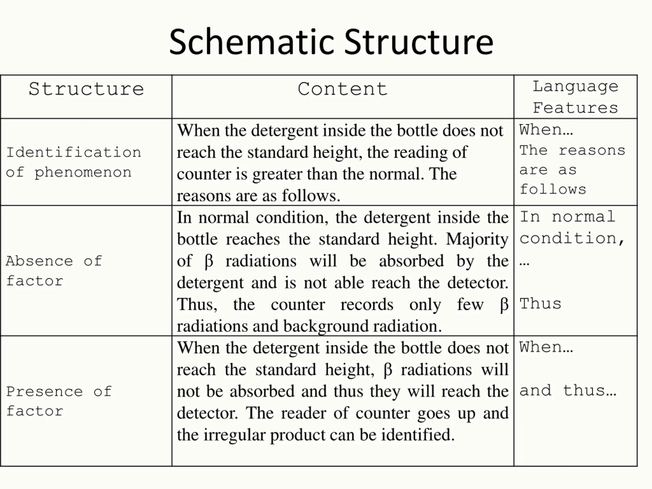 Schematic Structure Language Features When The reasons are as follows In normal condition, Structure Content When the detergent inside the bottle does not reach the standard height, the reading of counter is greater than the normal. The reasons are as follows. In normal condition, the detergent inside the bottle reaches the standard height. Majority of radiations will be absorbed by the detergent and is not able reach the detector. Thus, the counter records only few radiations and background radiation. When the detergent inside the bottle does not reach the standard height, radiations will not be absorbed and thus they will reach the detector. The reader of counter goes up and the irregular product can be identified. Identification of phenomenon Absence of factor Thus When and thus Presence of factor