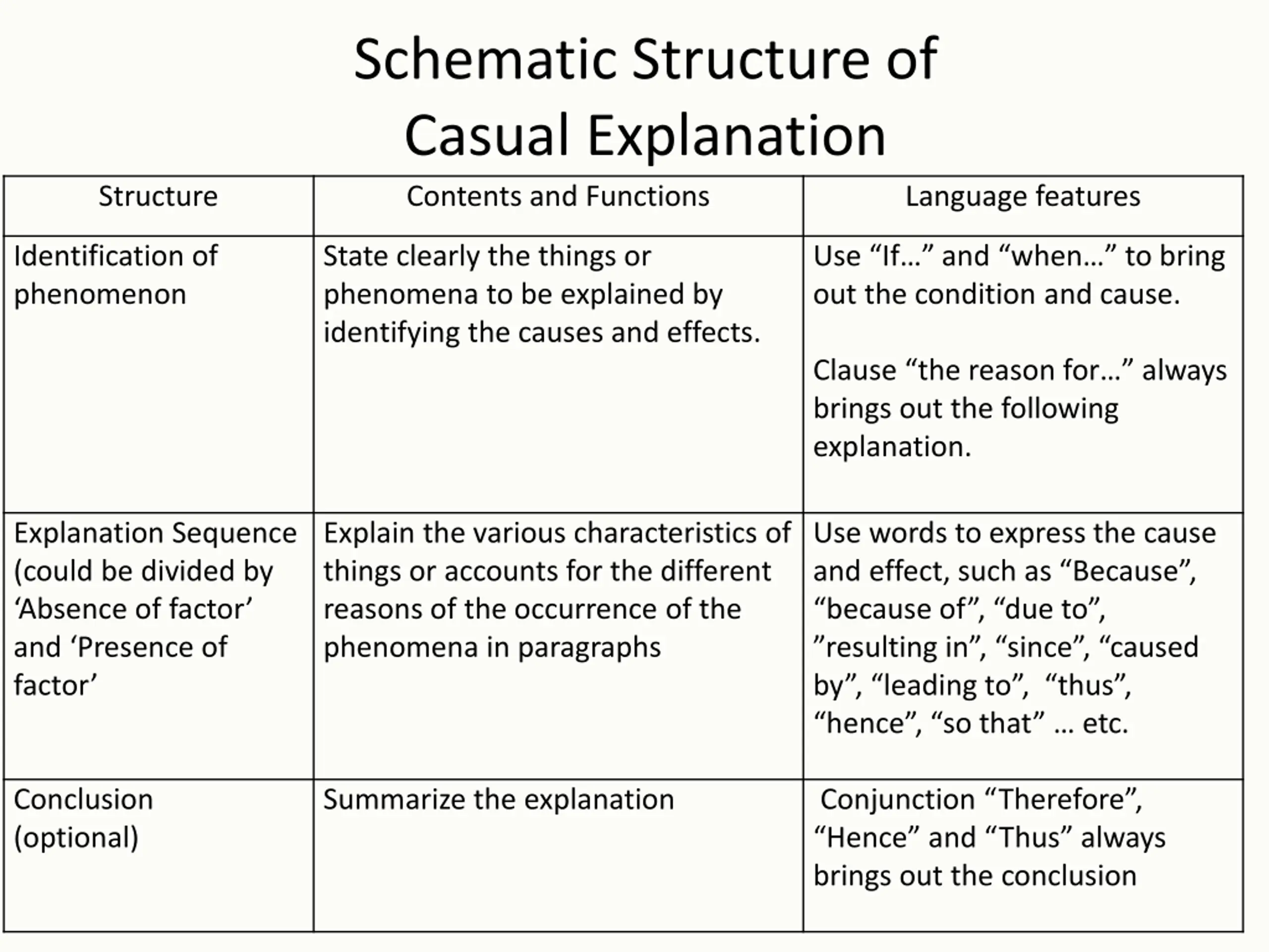 Schematic Structure of Casual Explanation Contents and Functions Structure Language features Identification of phenomenon State clearly the things or phenomena to be explained by identifying the causes and effects. Use If and when to bring out the condition and cause. Clause the reason for always brings out the following explanation. Explanation Sequence (could be divided by Absence of factor and Presence of factor Explain the various characteristics of things or accounts for the different reasons of the occurrence of the phenomena in paragraphs Use words to express the cause and effect, such as Because , because of , due to , resulting in , since , caused by , leading to , thus , hence , so that etc. Conclusion (optional) Summarize the explanation Conjunction Therefore , Hence and Thus always brings out the conclusion