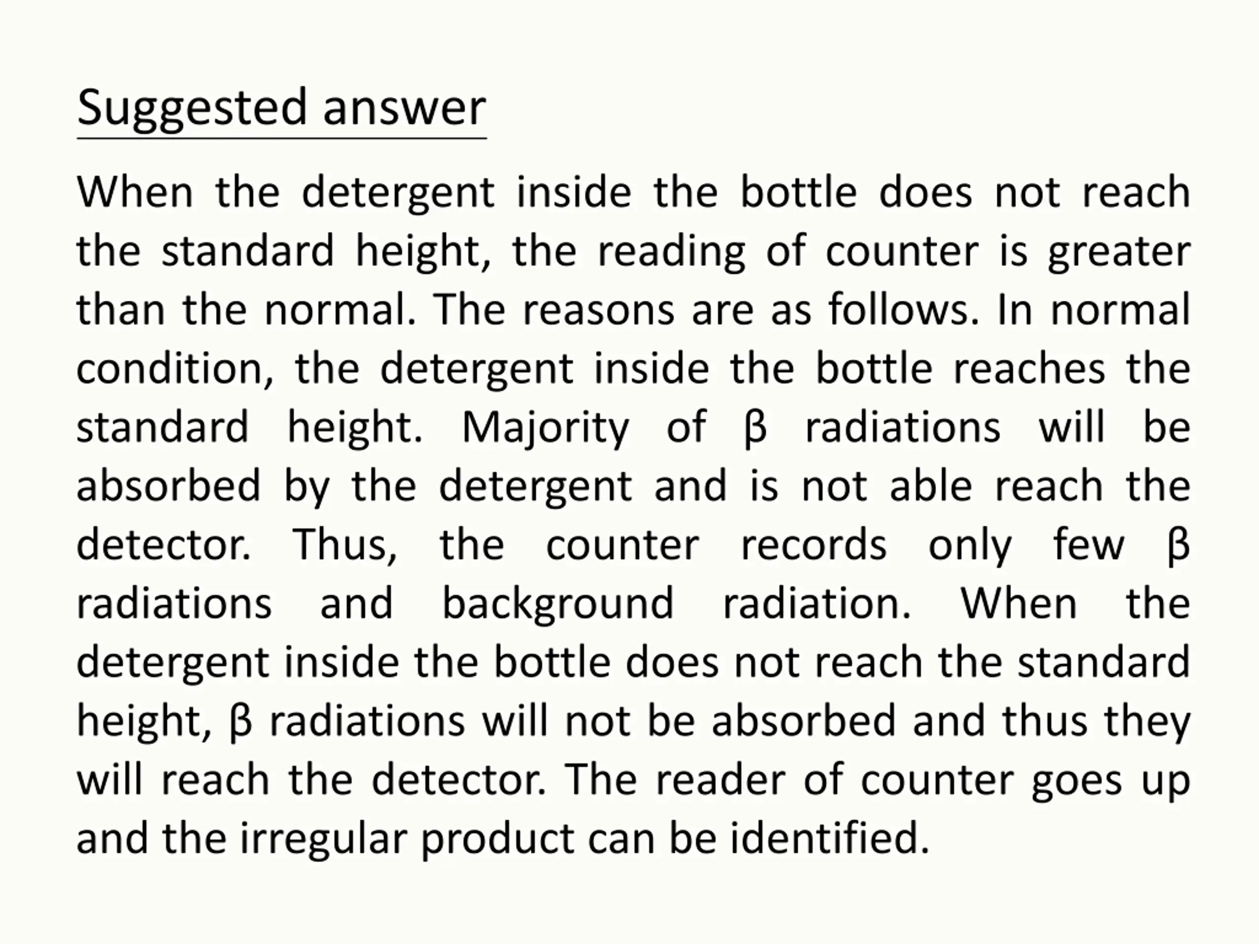 Suggested answer When the detergent inside the bottle does not reach the standard height, the reading of counter is greater than the normal. The reasons are as follows. In normal condition, the detergent inside the bottle reaches the standard height. Majority of radiations will be absorbed by the detergent and is not able reach the detector. Thus, the counter records only few radiations and background detergent inside the bottle does not reach the standard height, radiations will not be absorbed and thus they will reach the detector. The reader of counter goes up and the irregular product can be identified. radiation. When the