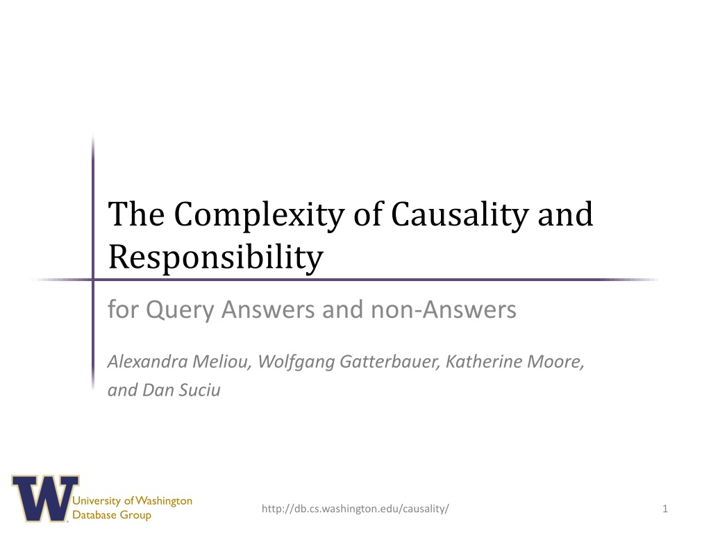The Complexity of Causality and Responsibility for Query Answers and non-Answers Alexandra Meliou, Wolfgang Gatterbauer, Katherine Moore, and Dan Suciu University of Washington Database Group http://db.cs.washington.edu/causality/ 1