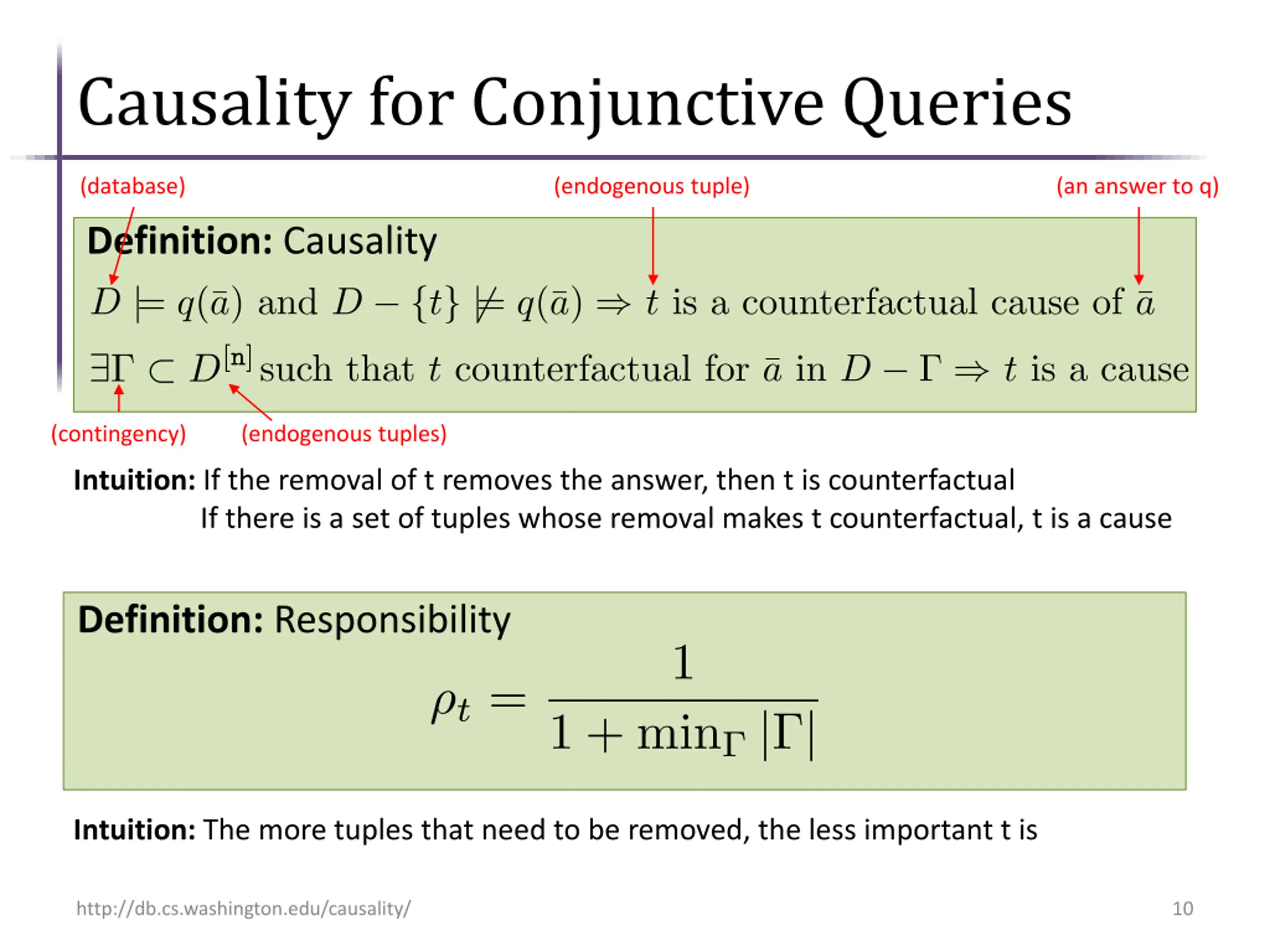 Responsibility (intuition) Measures the degree of causality, the contribution of a tuple A larger contingency, means a tuple has smaller degree of causality Counterfactual causes have the most contribution (empty contingency set) http://db.cs.washington.edu/causality/ 9