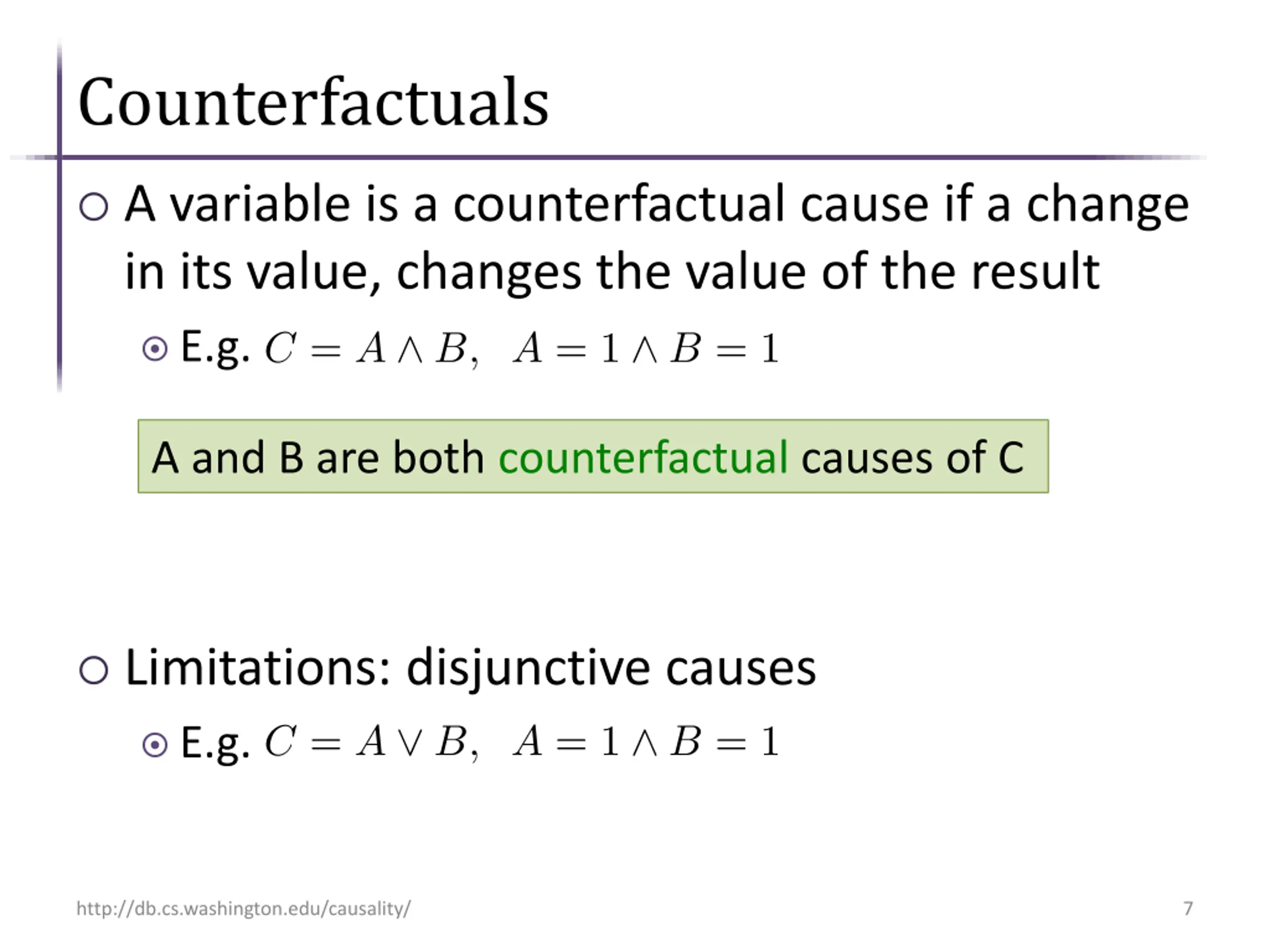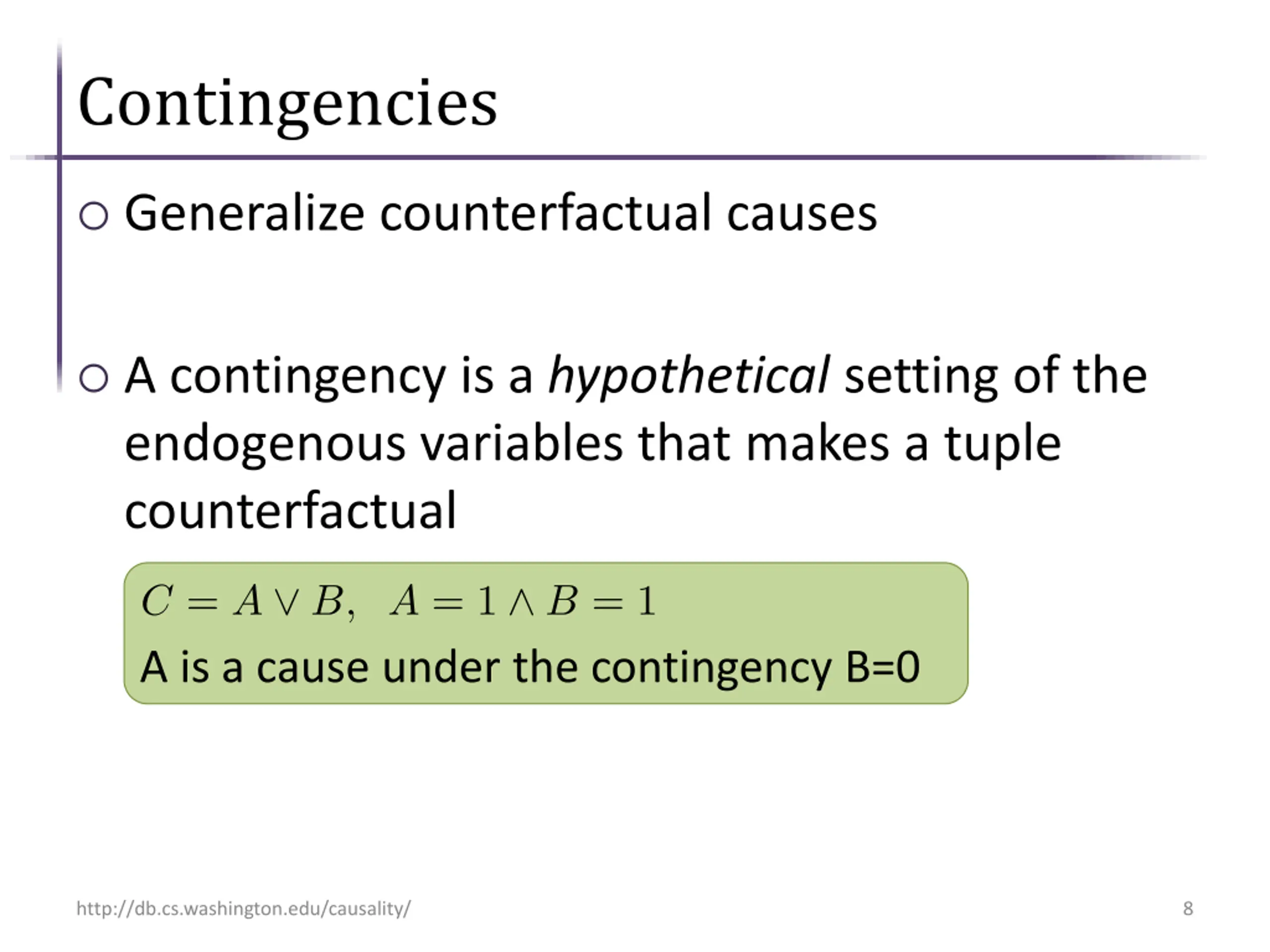 Counterfactuals A variable is a counterfactual cause if a change in its value, changes the value of the result E.g. A and B are both counterfactual causes of C Limitations: disjunctive causes E.g. http://db.cs.washington.edu/causality/ 7