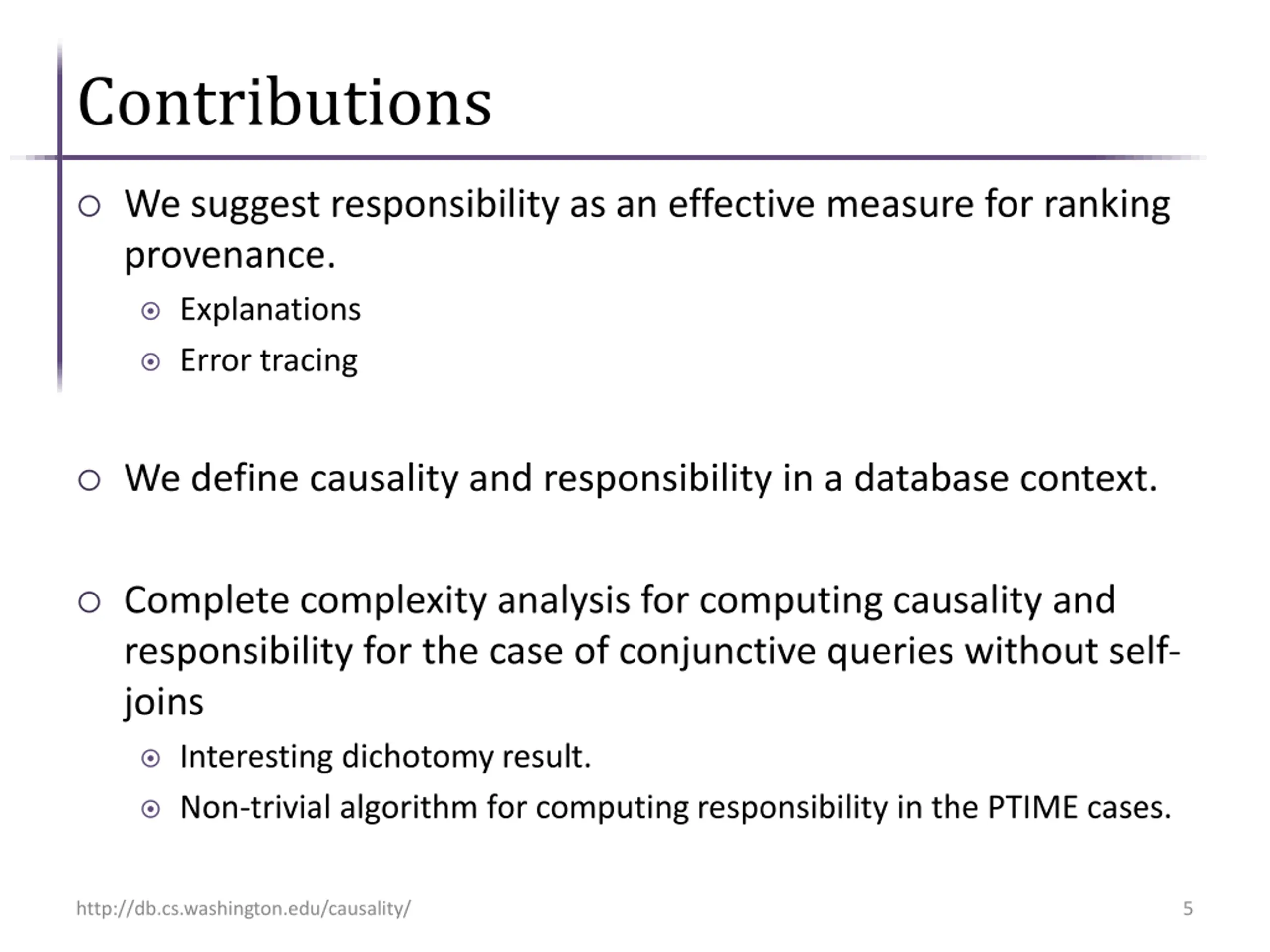 Solution: Causality The fundamental question of causality: What is the cause of an effect? Causality theory has long been studied in AI and philosophy. [Lewis73, EiterLucasiewicz02, HalpernPearl05, Menzies08] Offers a metric (responsibility) for measuring the contribution of a variable to an outcome ranking [ChocklerHalpern04] http://db.cs.washington.edu/causality/ 4