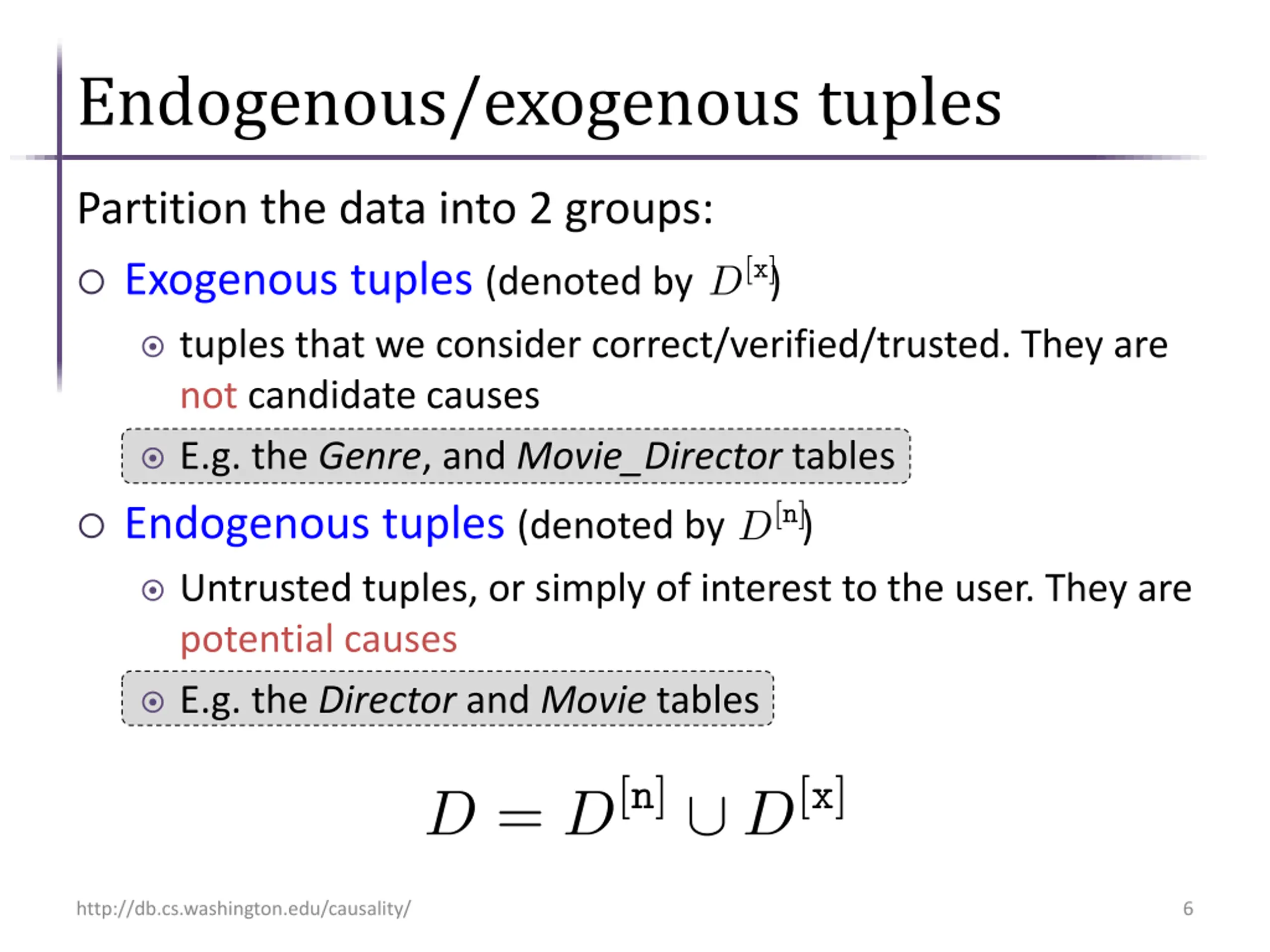 Endogenous/exogenous tuples Partition the data into 2 groups: Exogenous tuples (denoted by ) tuples that we consider correct/verified/trusted. They are not candidate causes E.g. the Genre, and Movie_Director tables Endogenous tuples (denoted by ) Untrusted tuples, or simply of interest to the user. They are potential causes E.g. the Director and Movie tables http://db.cs.washington.edu/causality/ 6