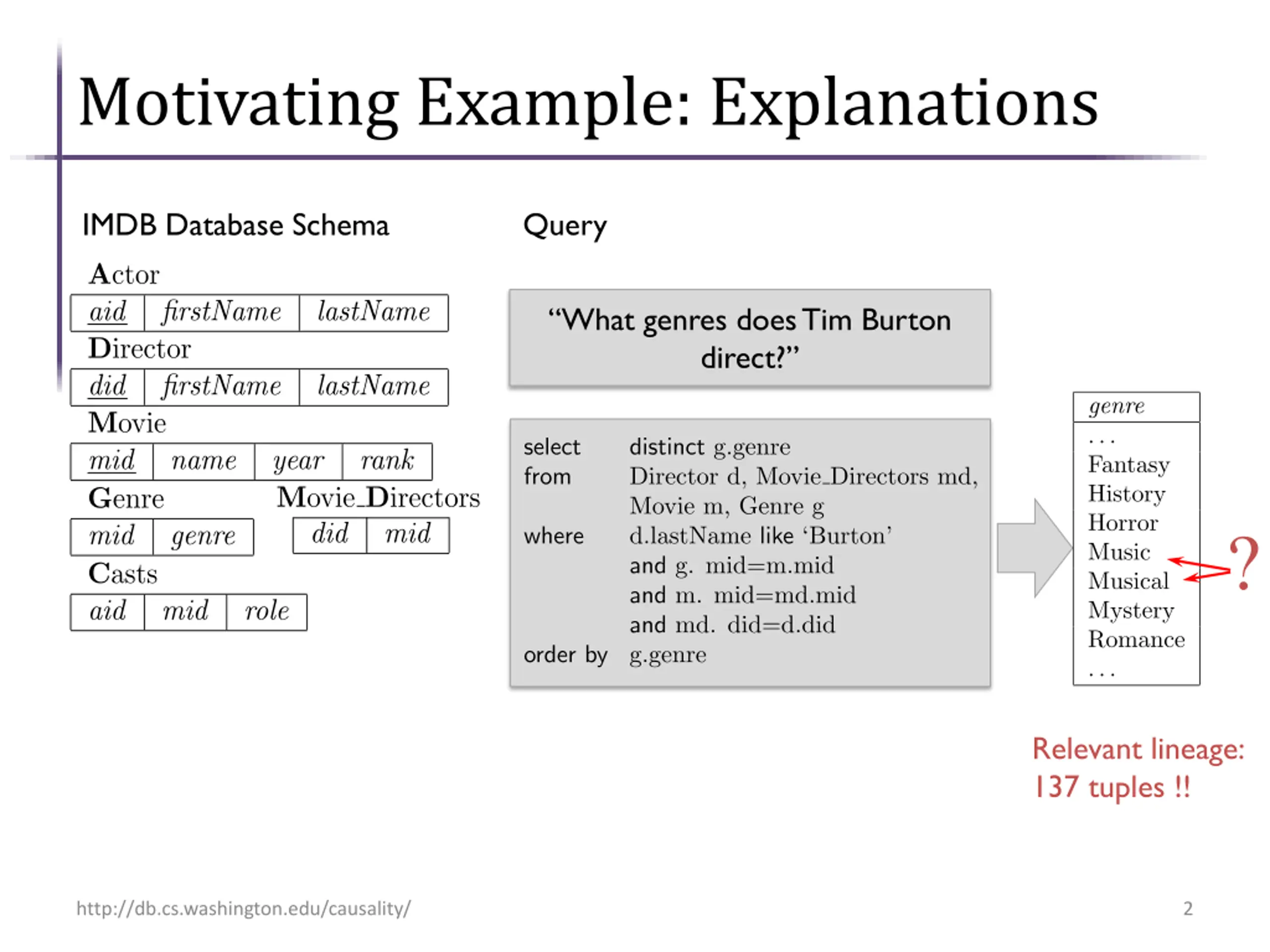 Motivating Example: Explanations IMDB Database Schema Query What genres does Tim Burton direct? ? Relevant lineage: 137 tuples !! http://db.cs.washington.edu/causality/ 2