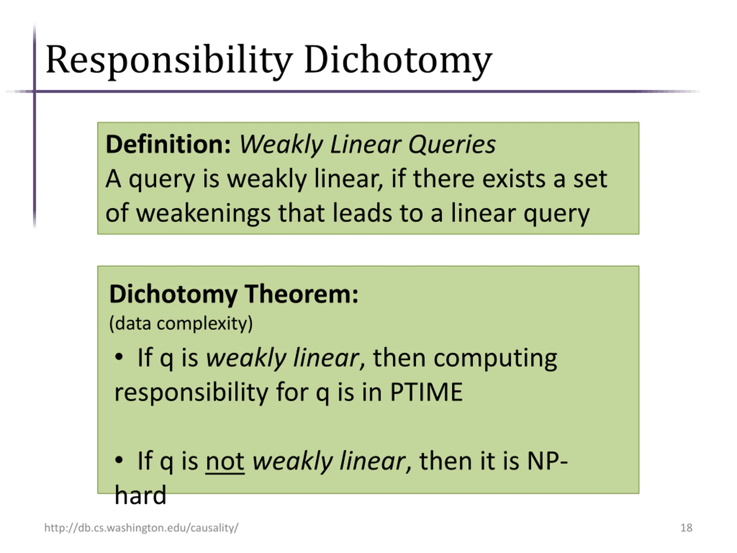 Weakenings NP-hard PTIME R is exogenous, and therefore its tuples cannot be part of the contingency set Expand R with the domain of z. Responsibility of T tuples is not affected! Dissociation http://db.cs.washington.edu/causality/ 17