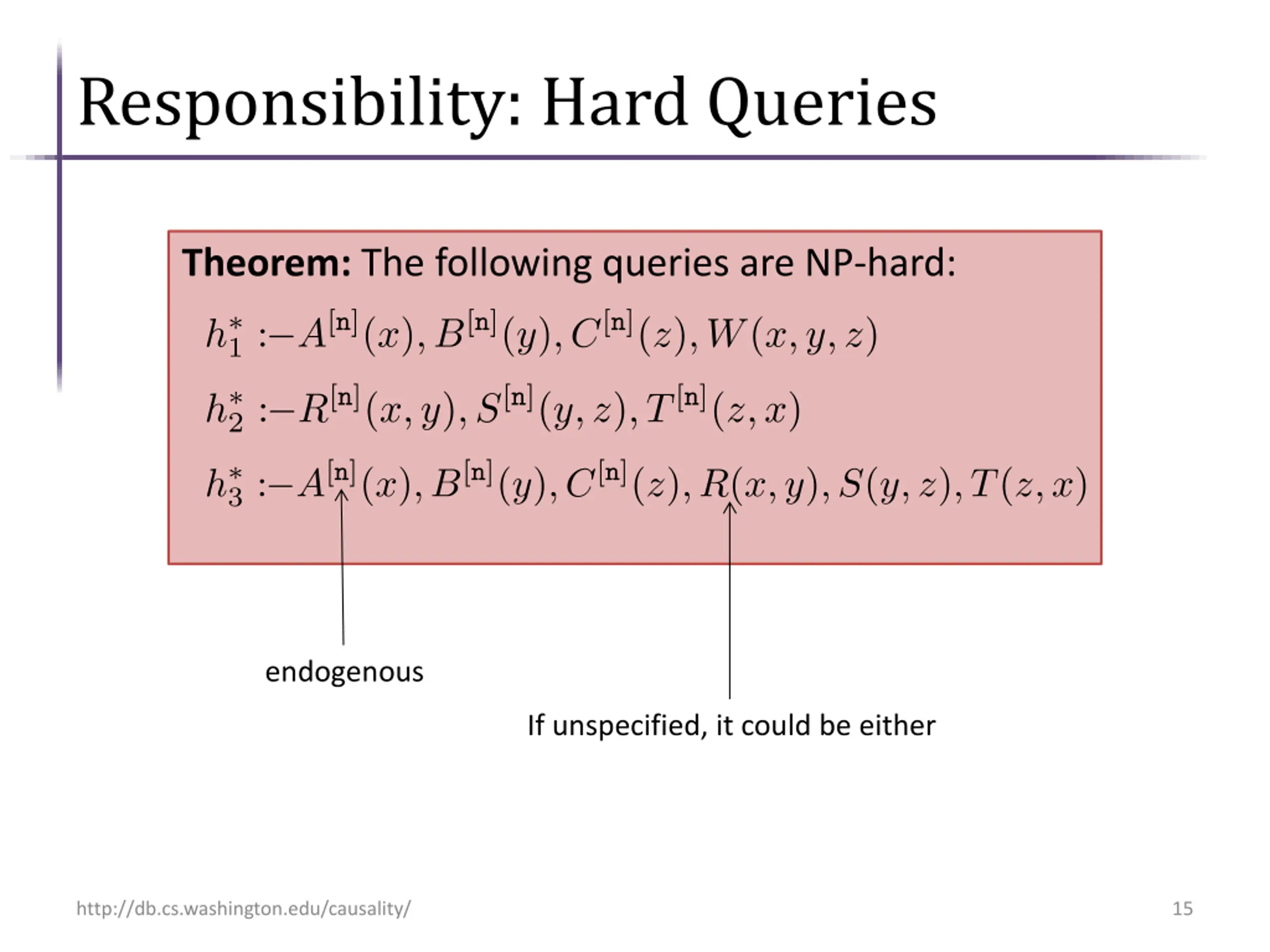 Responsibility: Hard Queries Theorem: The following queries are NP-hard: endogenous If unspecified, it could be either http://db.cs.washington.edu/causality/ 15