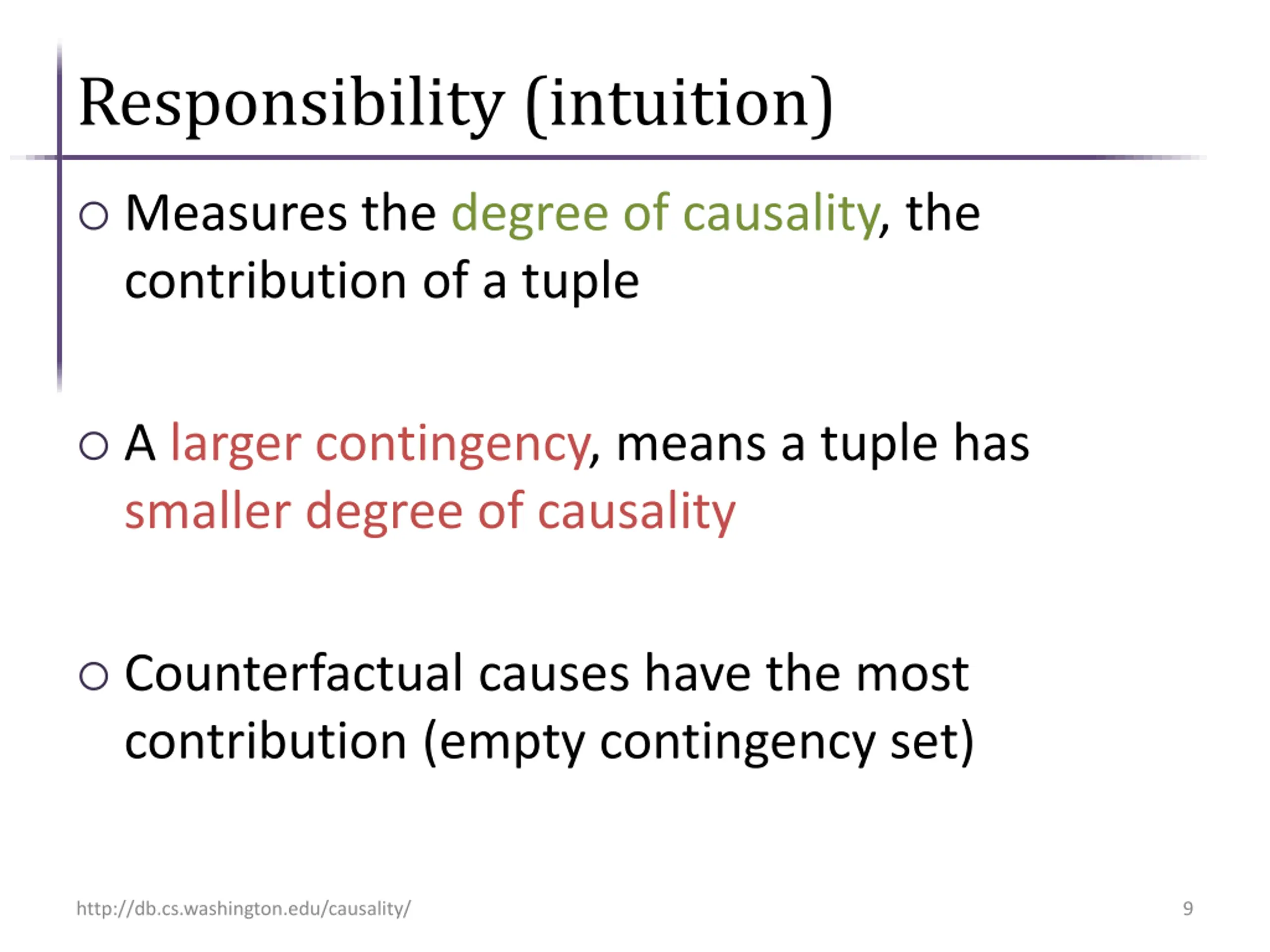 Contingencies Generalize counterfactual causes A contingency is a hypothetical setting of the endogenous variables that makes a tuple counterfactual A is a cause under the contingency B=0 http://db.cs.washington.edu/causality/ 8