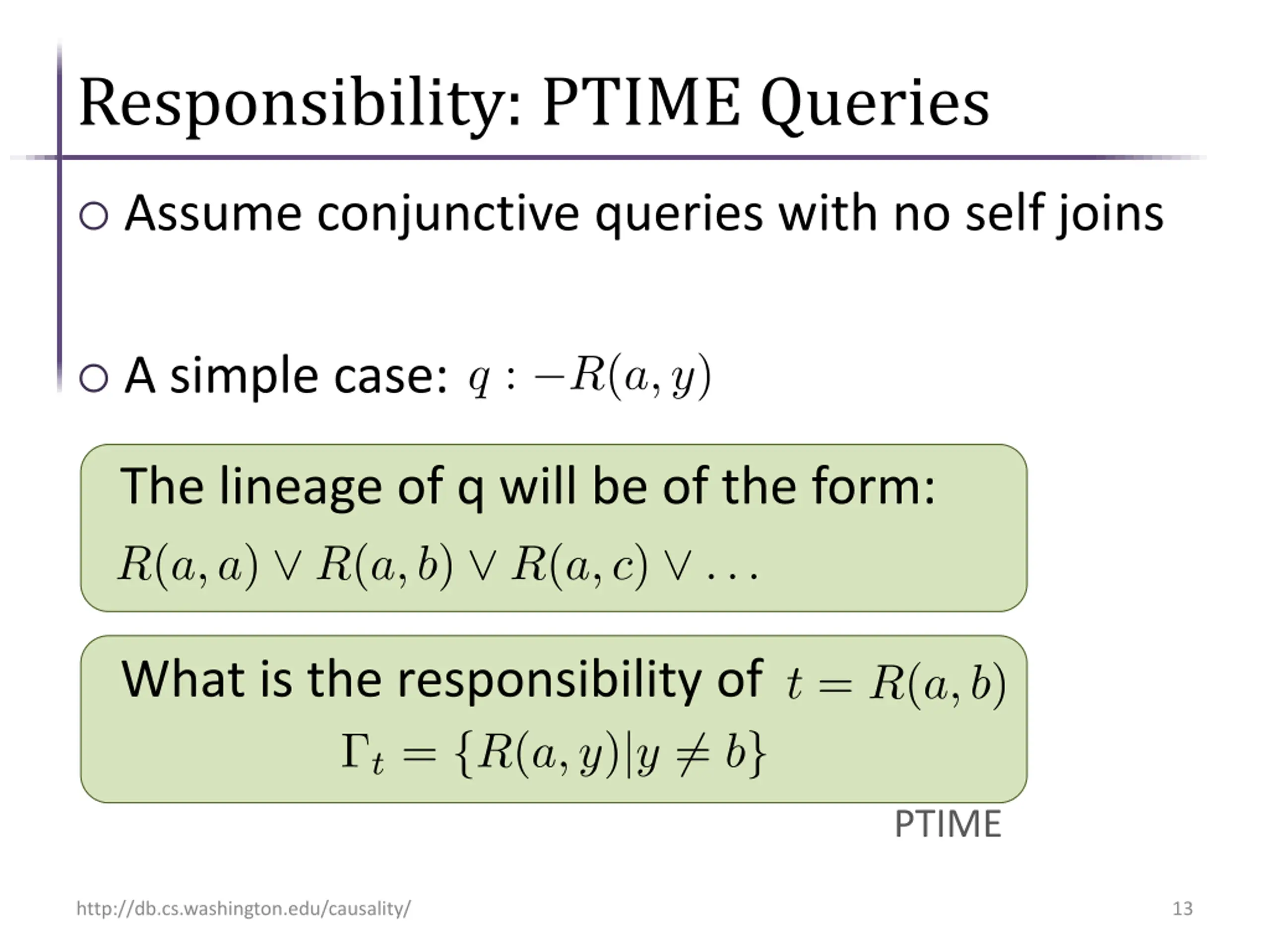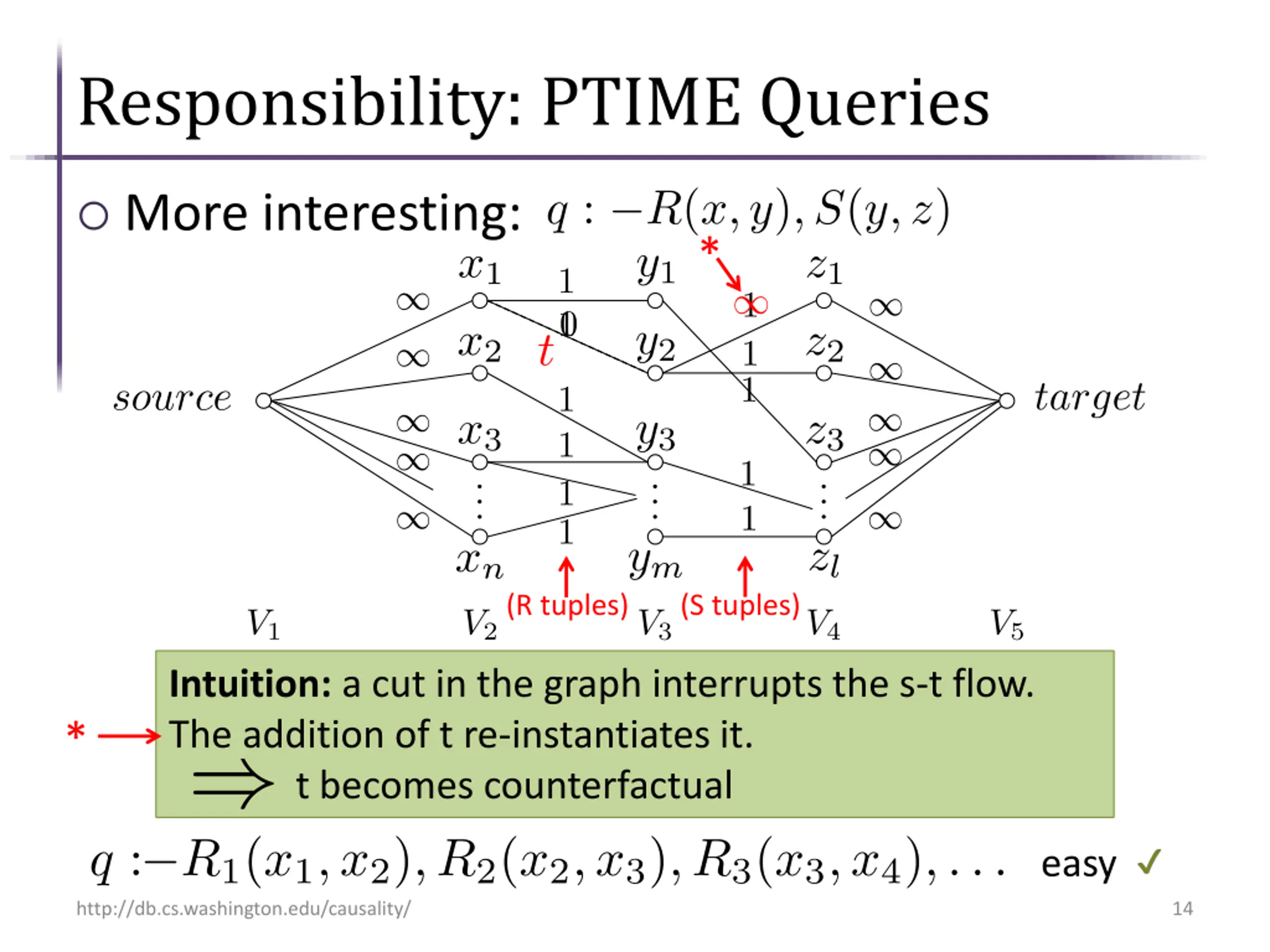 Responsibility: PTIME Queries Assume conjunctive queries with no self joins A simple case: The lineage of q will be of the form: What is the responsibility of PTIME http://db.cs.washington.edu/causality/ 13