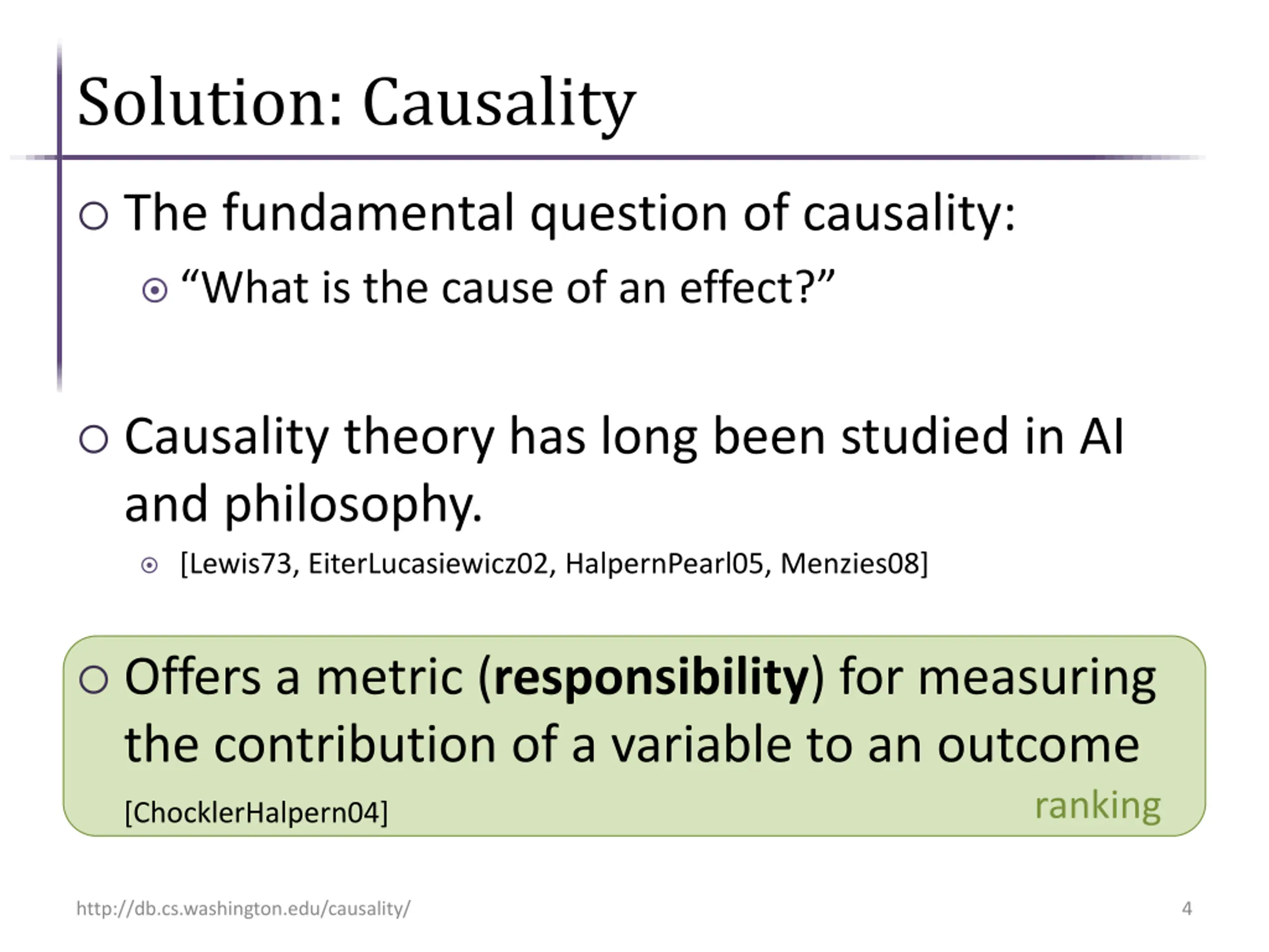 Example cont. (Musicals) unimportant tuple important tuples Ranking Provenance Goal: Rank tuples in order of importance http://db.cs.washington.edu/causality/ 3
