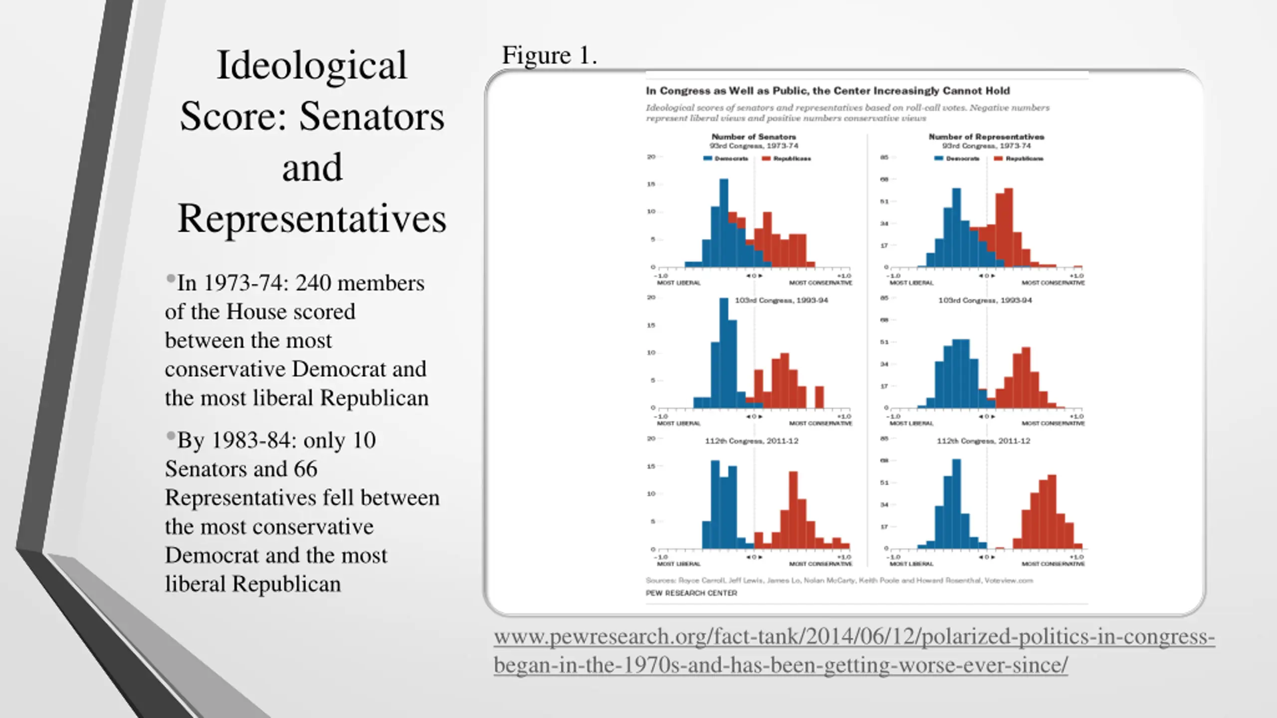Figure 1. Ideological Score: Senators and Representatives In 1973-74: 240 members of the House scored between the most conservative Democrat and the most liberal Republican By 1983-84: only 10 Senators and 66 Representatives fell between the most conservative Democrat and the most liberal Republican www.pewresearch.org/fact-tank/2014/06/12/polarized-politics-in-congress- began-in-the-1970s-and-has-been-getting-worse-ever-since/