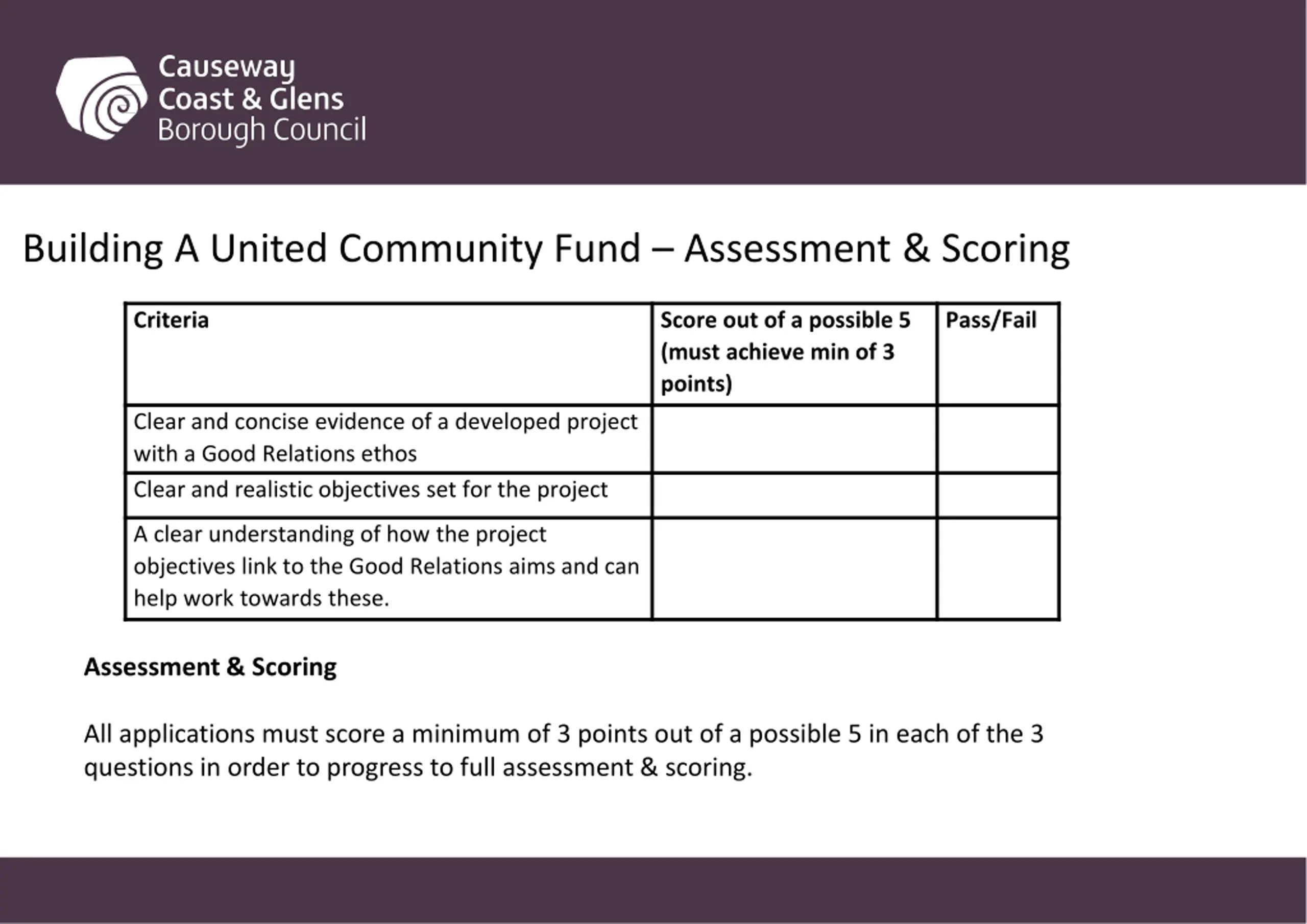 Building A United Community Fund Assessment & Scoring Criteria Score out of a possible 5 (must achieve min of 3 points) Pass/Fail Clear and concise evidence of a developed project with a Good Relations ethos Clear and realistic objectives set for the project A clear understanding of how the project objectives link to the Good Relations aims and can help work towards these. Assessment & Scoring All applications must score a minimum of 3 points out of a possible 5 in each of the 3 questions in order to progress to full assessment & scoring.