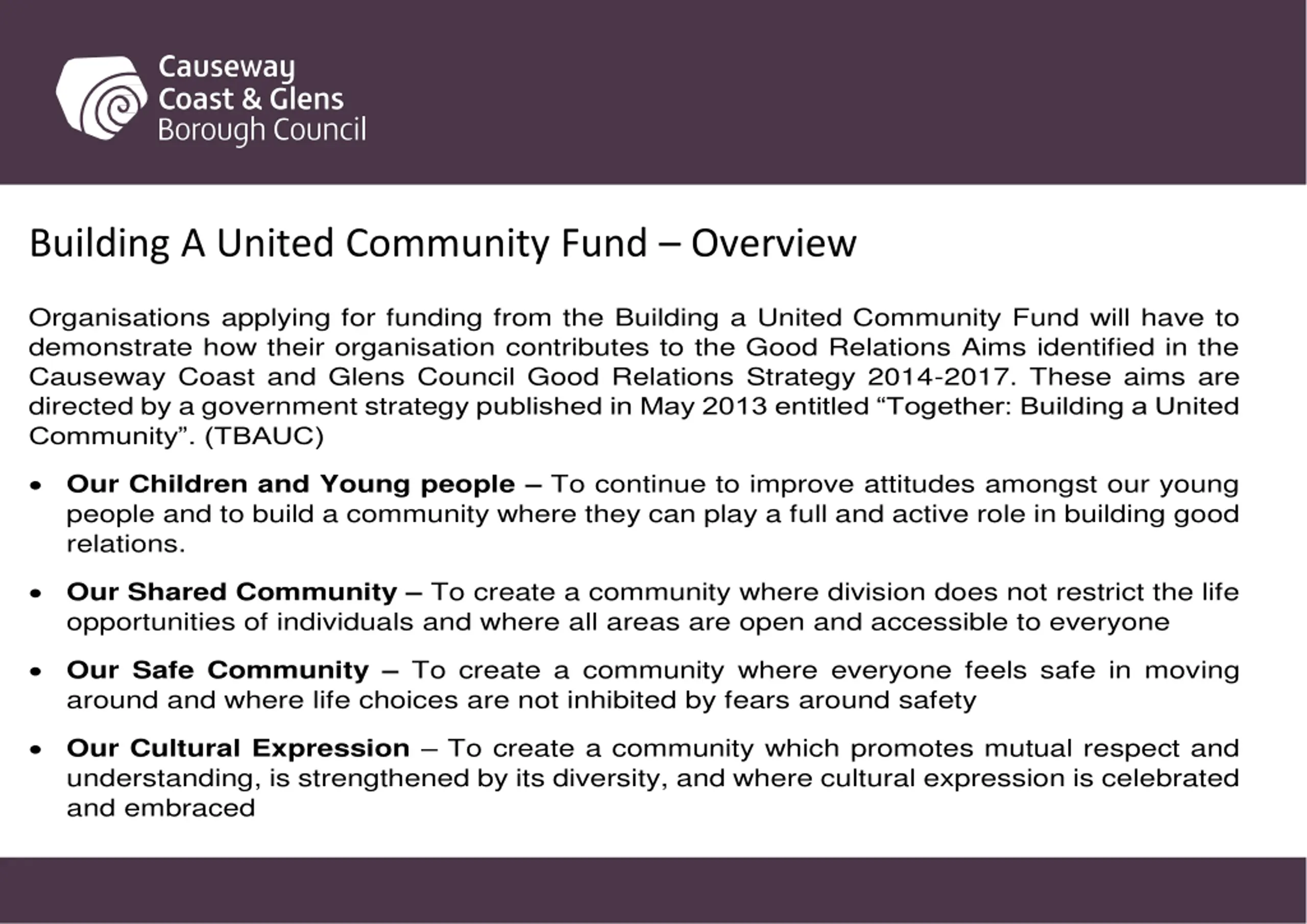 Building A United Community Fund Overview Organisations applying for funding from the Building a United Community Fund will have to demonstrate how their organisation contributes to the Good Relations Aims identified in the Causeway Coast and Glens Council Good Relations Strategy 2014-2017. These aims are directed by a government strategy published in May 2013 entitled Together: Building a United Community . (TBAUC) Our Children and Young people To continue to improve attitudes amongst our young people and to build a community where they can play a full and active role in building good relations. Our Shared Community To create a community where division does not restrict the life opportunities of individuals and where all areas are open and accessible to everyone Our Safe Community To create a community where everyone feels safe in moving around and where life choices are not inhibited by fears around safety Our Cultural Expression To create a community which promotes mutual respect and understanding, is strengthened by its diversity, and where cultural expression is celebrated and embraced