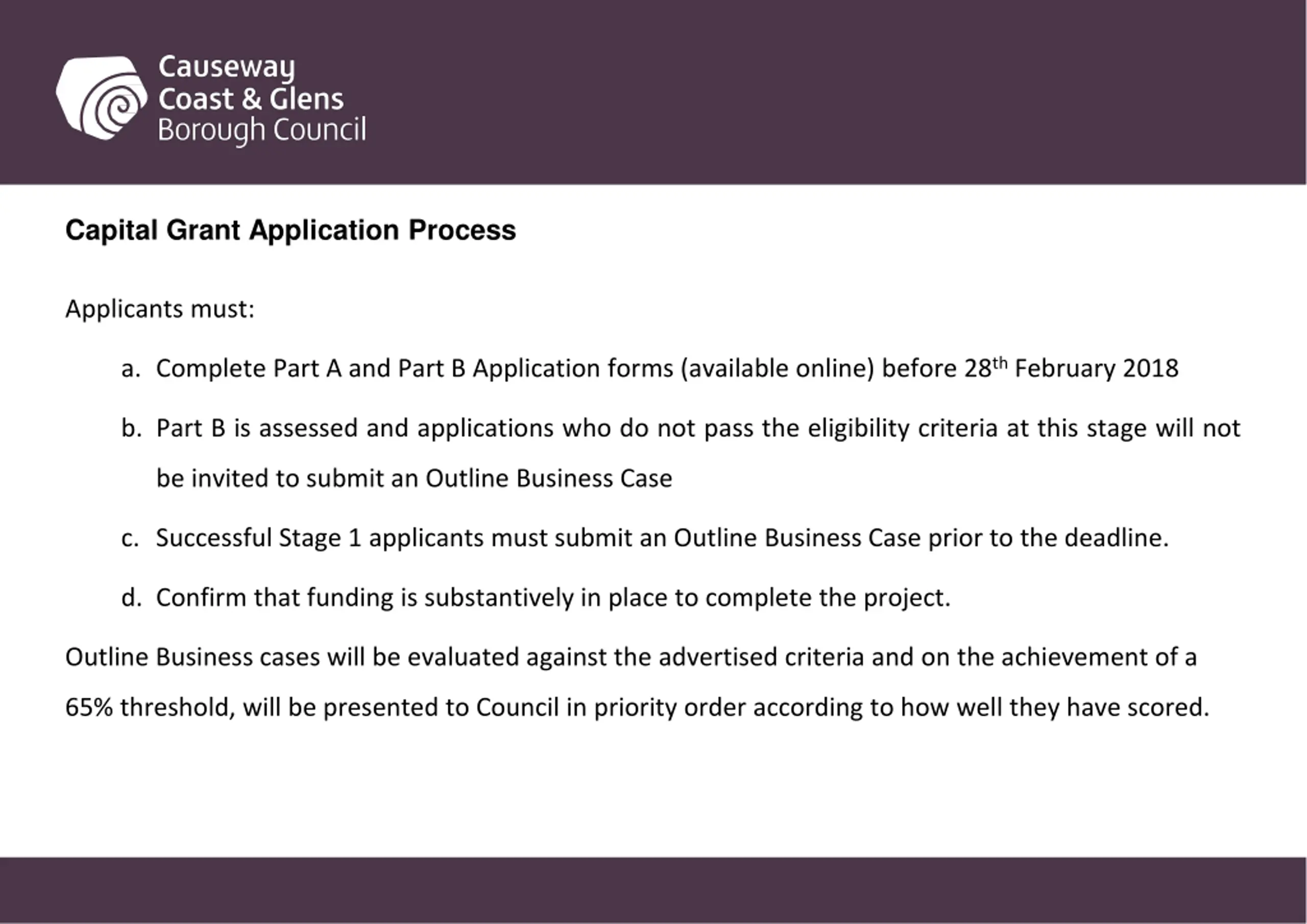 Capital Grant Application Process Applicants must: a. Complete Part A and Part B Application forms (available online) before 28th February 2018 b. Part B is assessed and applications who do not pass the eligibility criteria at this stage will not be invited to submit an Outline Business Case c. Successful Stage 1 applicants must submit an Outline Business Case prior to the deadline. d. Confirm that funding is substantively in place to complete the project. Outline Business cases will be evaluated against the advertised criteria and on the achievement of a 65% threshold, will be presented to Council in priority order according to how well they have scored.