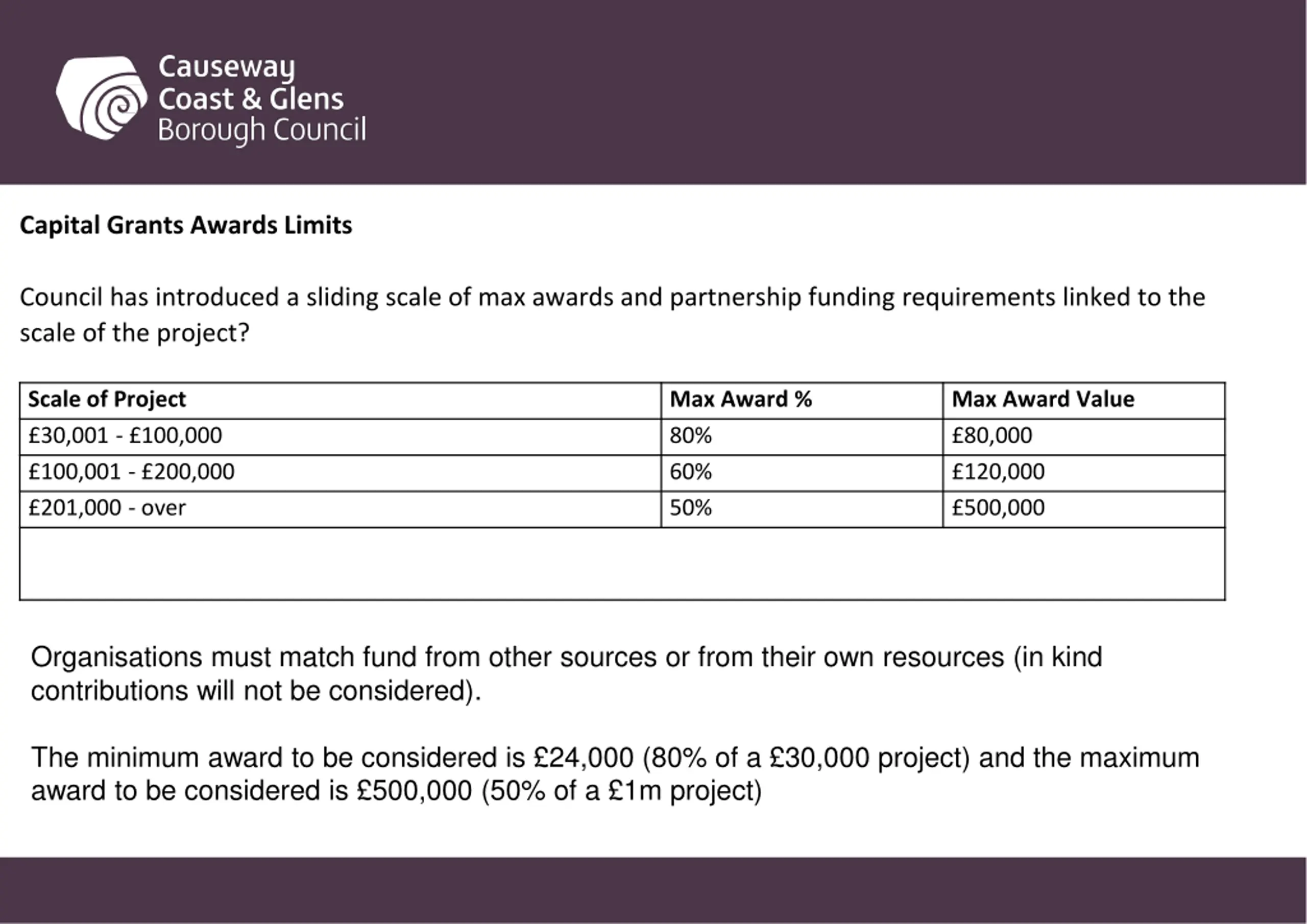 Capital Grants Awards Limits Council has introduced a sliding scale of max awards and partnership funding requirements linked to the scale of the project? Scale of Project 30,001 - 100,000 100,001 - 200,000 201,000 - over Max Award % 80% 60% 50% Max Award Value 80,000 120,000 500,000 Organisations must match fund from other sources or from their own resources (in kind contributions will not be considered). The minimum award to be considered is 24,000 (80% of a 30,000 project) and the maximum award to be considered is 500,000 (50% of a 1m project)