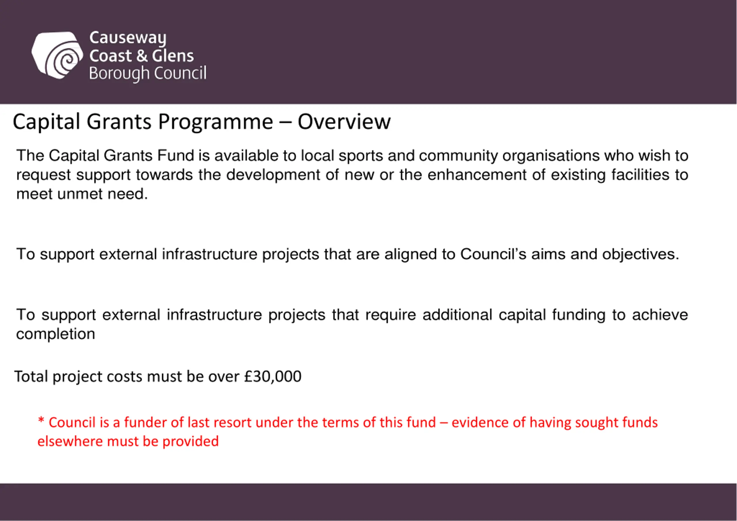 Capital Grants Programme Overview The Capital Grants Fundis available to local sports and community organisations who wish to request support towards the development of new or the enhancement of existing facilities to meet unmet need. To support external infrastructure projects that are aligned to Council s aims and objectives. To support external infrastructure projects that require additional capital funding to achieve completion Total project costs must be over 30,000 * Council is a funder of last resort under the terms of this fund evidence of having sought funds elsewhere must be provided