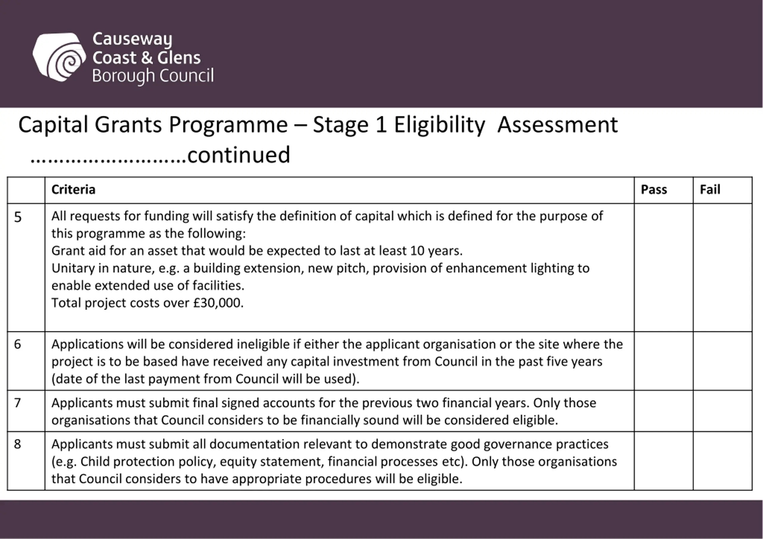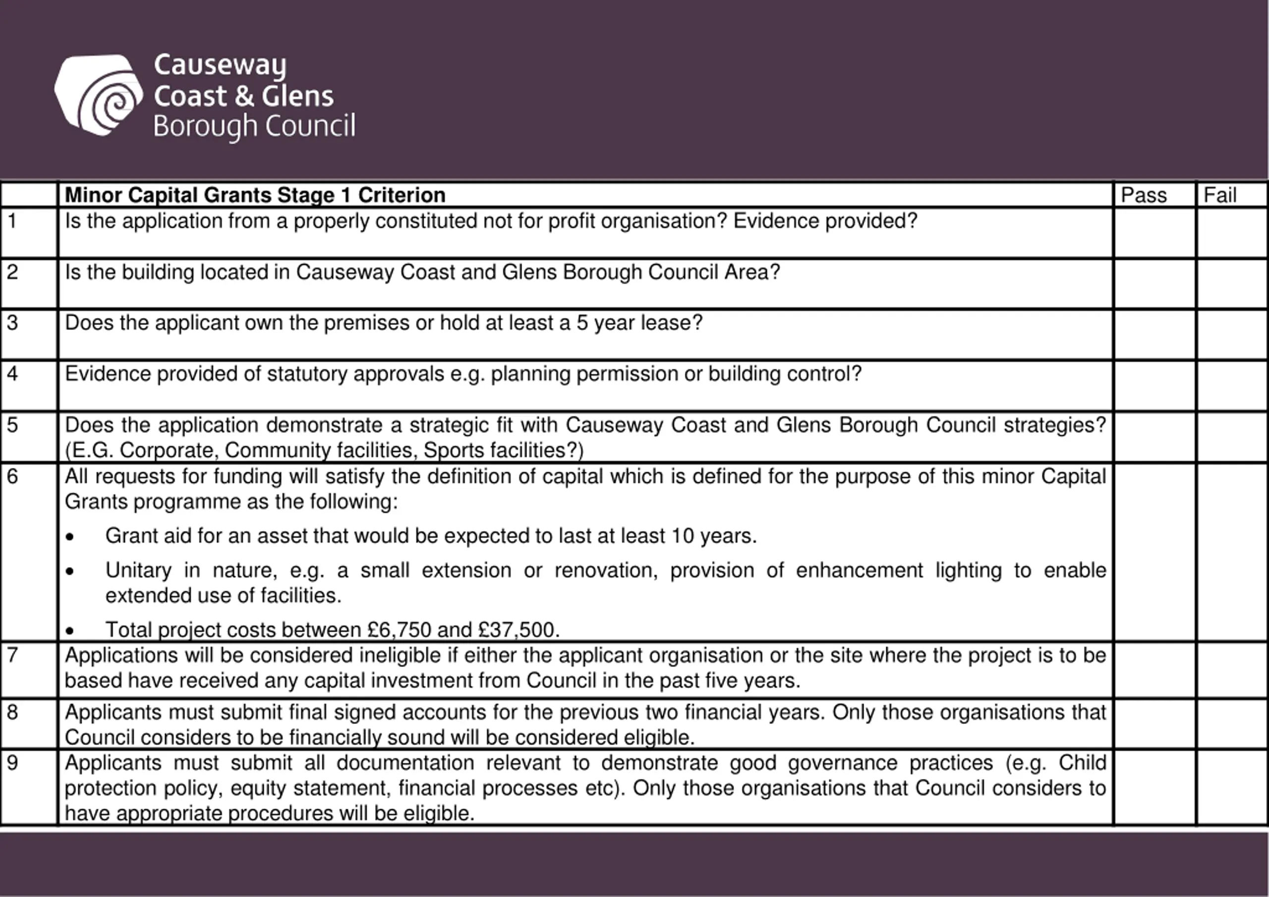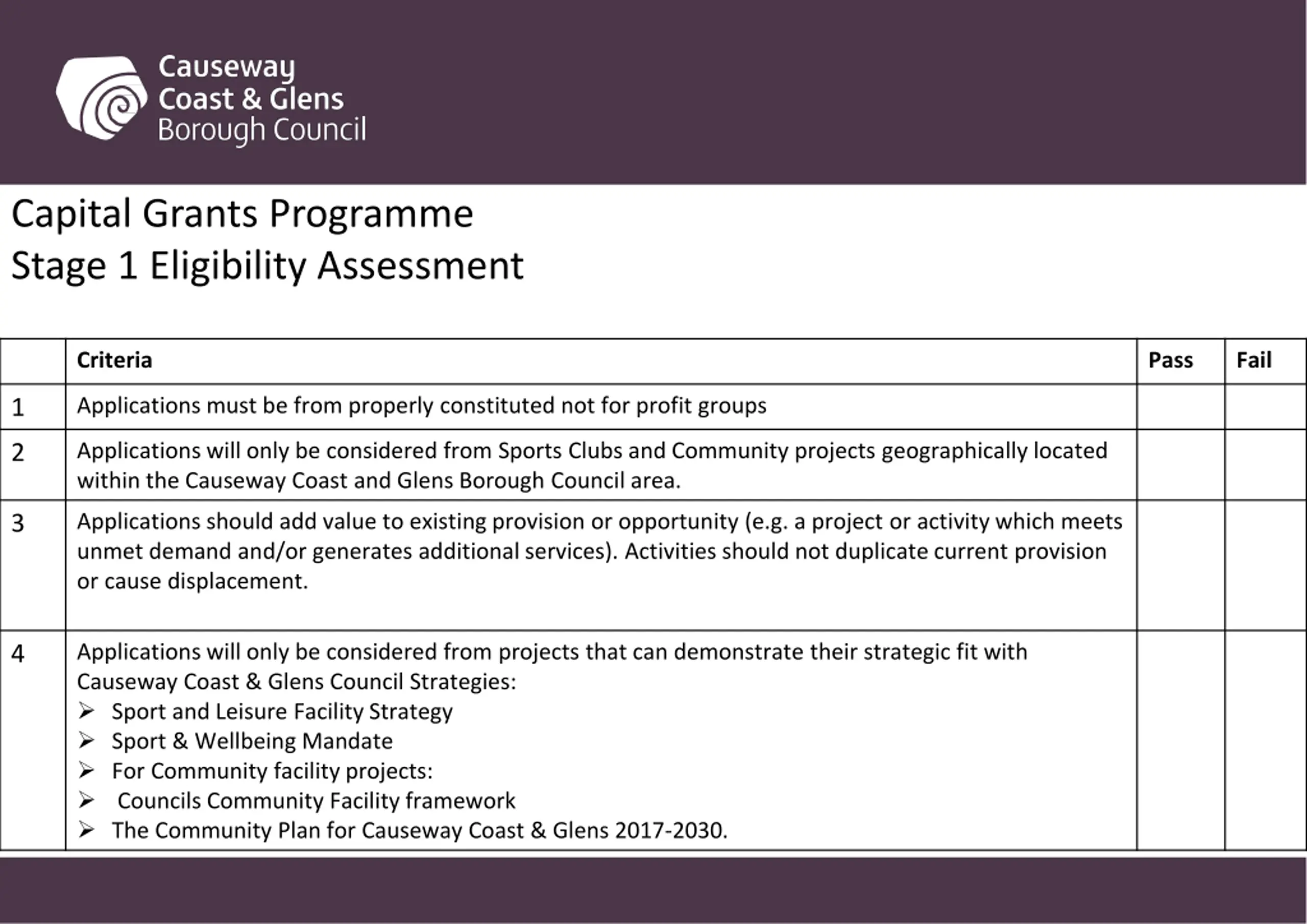 Capital Grants Programme Stage 1 Eligibility Assessment Criteria Pass Fail Applications must be from properly constituted not for profit groups 1 Applications will only be considered from Sports Clubs and Community projects geographically located within the Causeway Coast and Glens Borough Council area. 2 Applications should add value to existing provision or opportunity (e.g. a project or activity which meets unmet demand and/or generates additional services). Activities should not duplicate current provision or cause displacement. 3 Applications will only be considered from projects that can demonstrate their strategic fit with Causeway Coast & Glens Council Strategies: Sport and Leisure Facility Strategy Sport & Wellbeing Mandate For Community facility projects: Councils Community Facility framework The Community Plan for Causeway Coast & Glens 2017-2030. 4