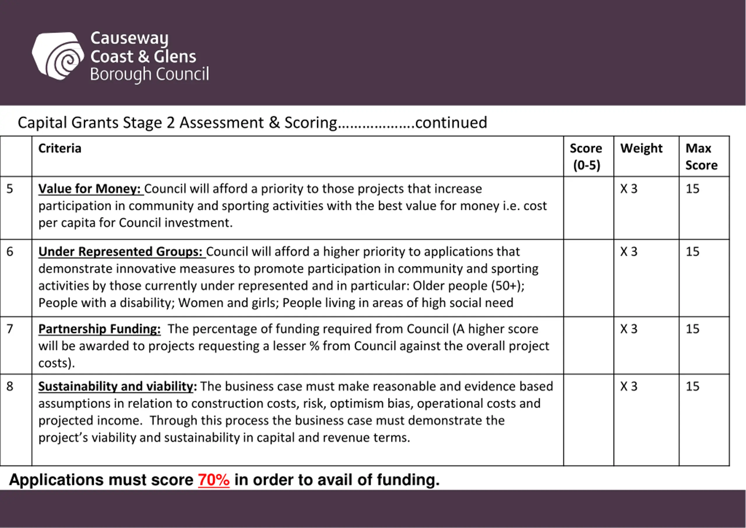 Capital Grants Stage 2 Assessment & Scoring.continued Criteria Score (0-5) Weight Max Score Applications must score 65% in order to avail of funding. Value for Money: Council will afford a priority to those projects that increase participation in community and sporting activities with the best value for money i.e. cost per capita for Council investment. 5 X 3 15 6 Under Represented Groups: Council will afford a higher priority to applications that demonstrate innovative measures to promote participation in community and sporting activities by those currently under represented and in particular: Older people (50+); People with a disability; Women and girls; People living in areas of high social need X 3 15 7 Partnership Funding: The percentage of funding required from Council (A higher score will be awarded to projects requesting a lesser % from Council against the overall project costs). X 3 15 8 Sustainability and viability: The business case must make reasonable and evidence based assumptions in relation to construction costs, risk, optimism bias, operational costs and projected income. Through this process the business case must demonstrate the project s viability and sustainability in capital and revenue terms. X 3 15 Applications must score 70% in order to avail of funding.