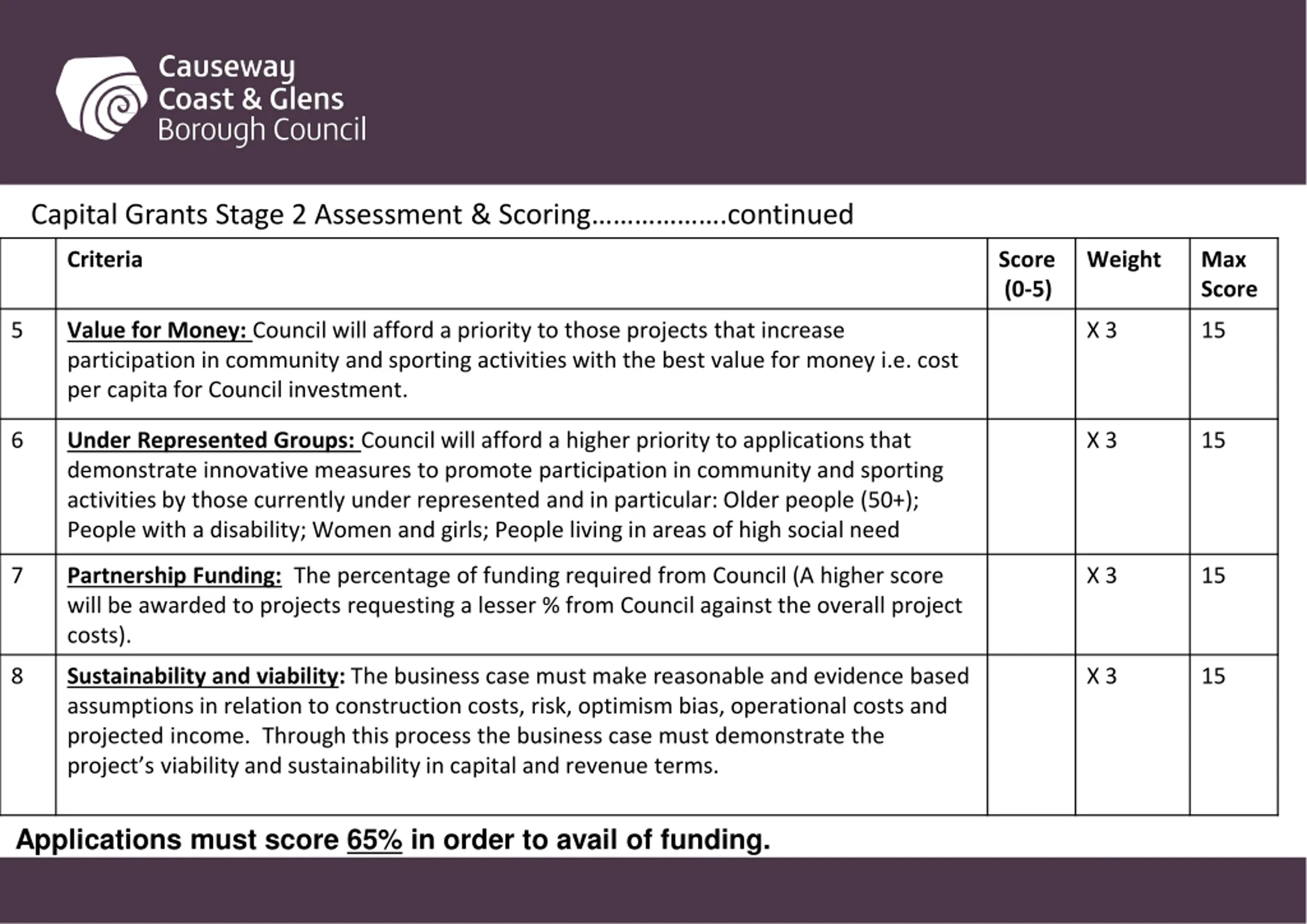 Capital Grants Stage 2 Assessment & Scoring.continued Criteria Score (0-5) Weight Max Score Applications must score 65% in order to avail of funding. Value for Money: Council will afford a priority to those projects that increase participation in community and sporting activities with the best value for money i.e. cost per capita for Council investment. 5 X 3 15 6 Under Represented Groups: Council will afford a higher priority to applications that demonstrate innovative measures to promote participation in community and sporting activities by those currently under represented and in particular: Older people (50+); People with a disability; Women and girls; People living in areas of high social need X 3 15 7 Partnership Funding: The percentage of funding required from Council (A higher score will be awarded to projects requesting a lesser % from Council against the overall project costs). X 3 15 8 Sustainability and viability: The business case must make reasonable and evidence based assumptions in relation to construction costs, risk, optimism bias, operational costs and projected income. Through this process the business case must demonstrate the project s viability and sustainability in capital and revenue terms. X 3 15 Applications must score 65% in order to avail of funding.