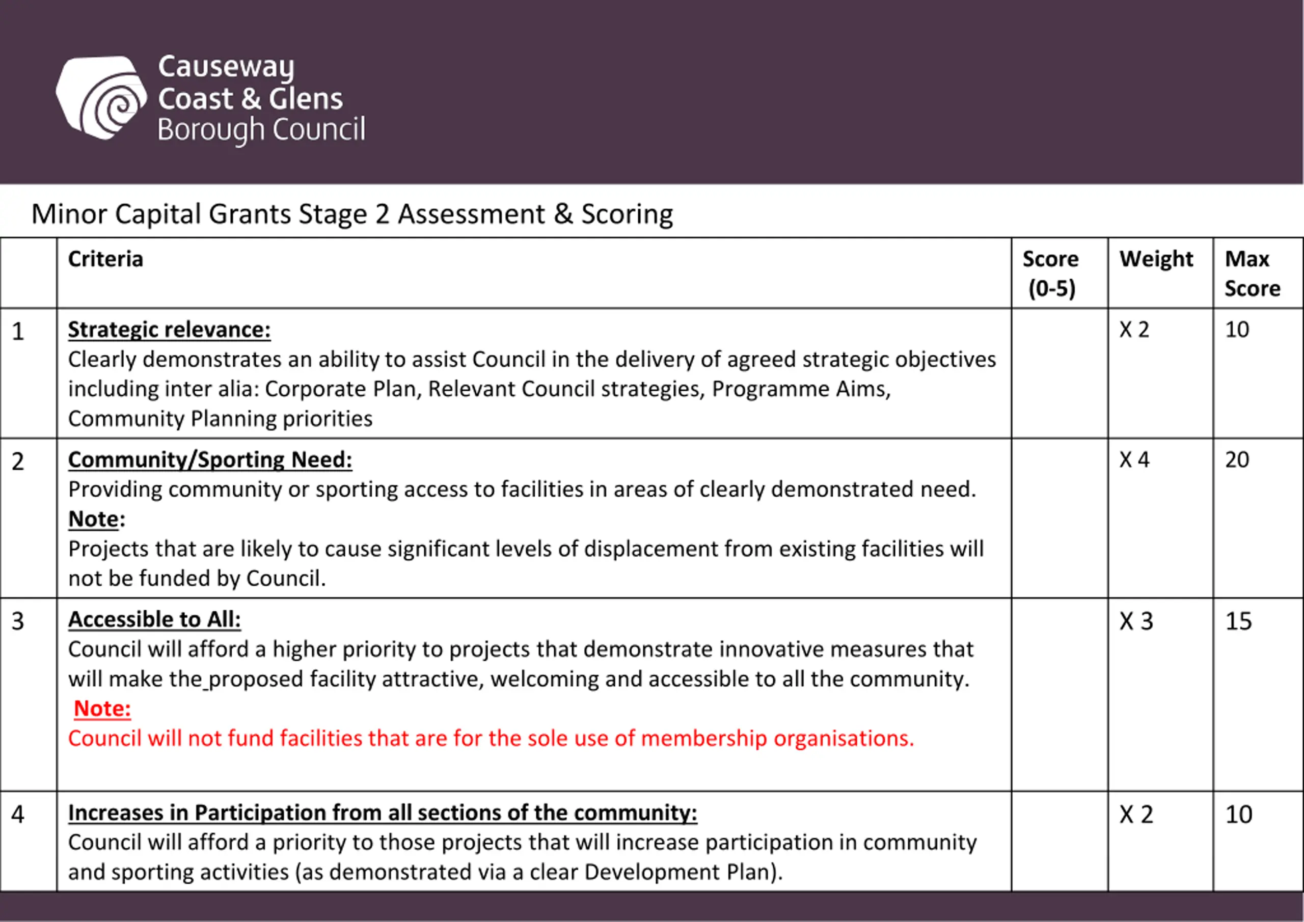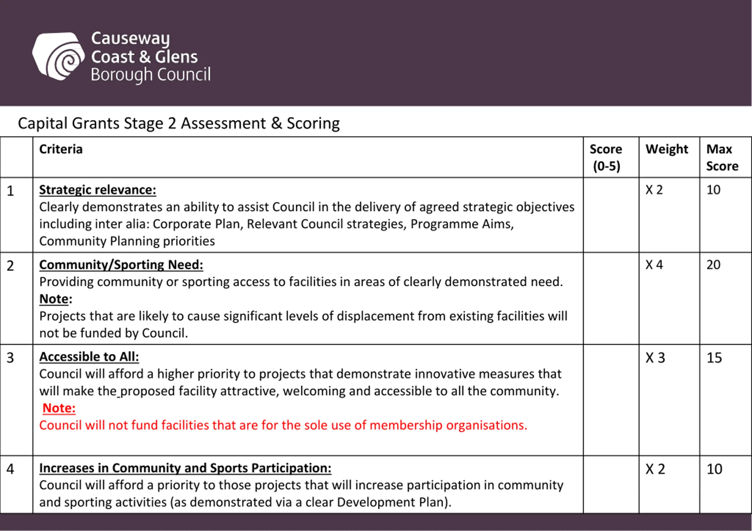 Capital Grants Stage 2 Assessment & Scoring Criteria Score (0-5) Weight Max Score Strategic relevance: Clearly demonstrates an ability to assist Council in the delivery of agreed strategic objectives including inter alia: Corporate Plan, Relevant Council strategies, Programme Aims, Community Planning priorities X 2 10 1 Community/Sporting Need: Providing community or sporting access to facilities in areas of clearly demonstrated need. Note: Projects that are likely to cause significant levels of displacement from existing facilities will not be funded by Council. X 4 20 2 Accessible to All: Council will afford a higher priority to projects that demonstrate innovative measures that will make the proposed facility attractive, welcoming and accessible to all the community. Note: Council will not fund facilities that are for the sole use of membership organisations. 3 X 3 15 Increases in Community and Sports Participation: Council will afford a priority to those projects that will increase participation in community and sporting activities (as demonstrated via a clear Development Plan). 4 X 2 10