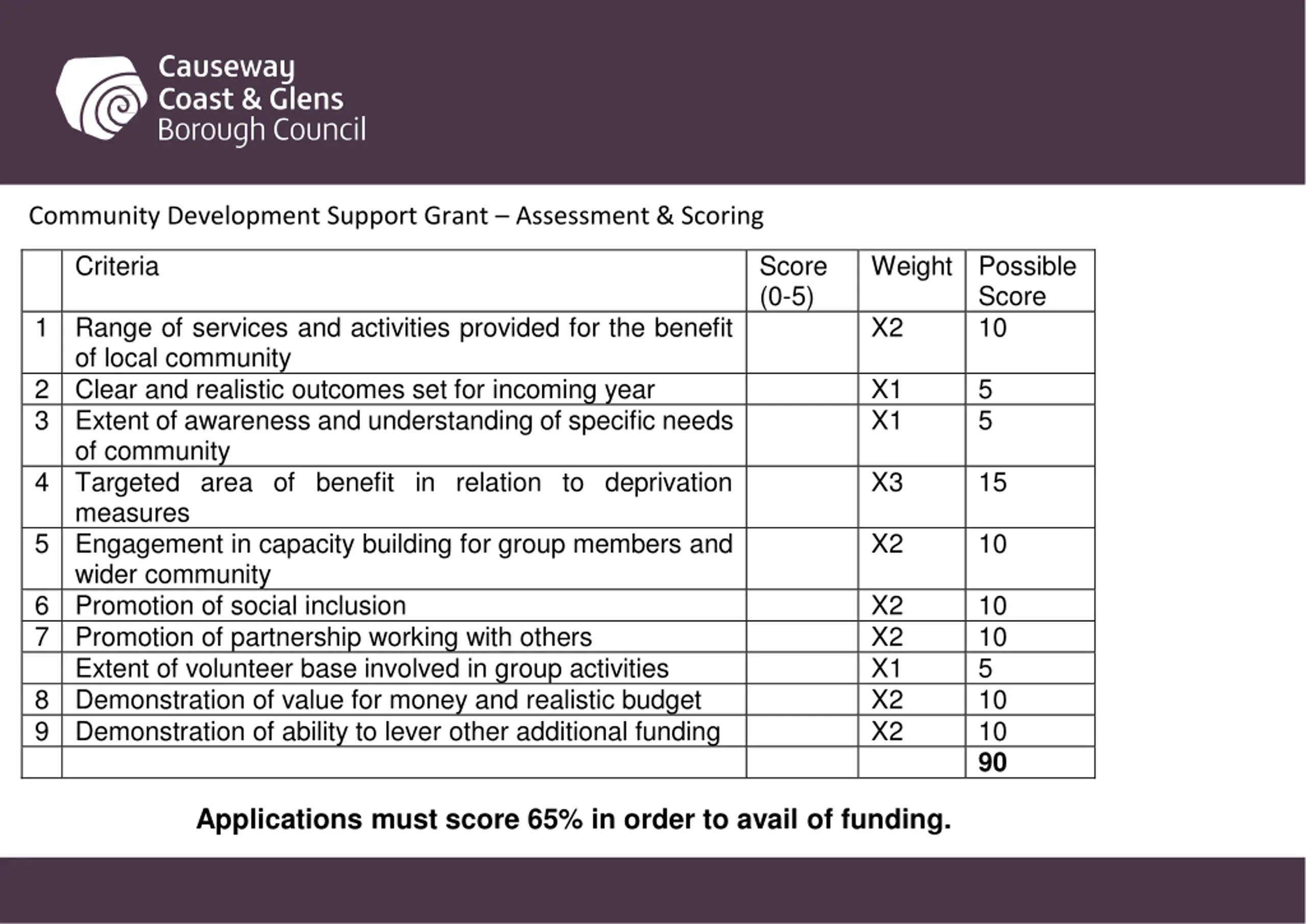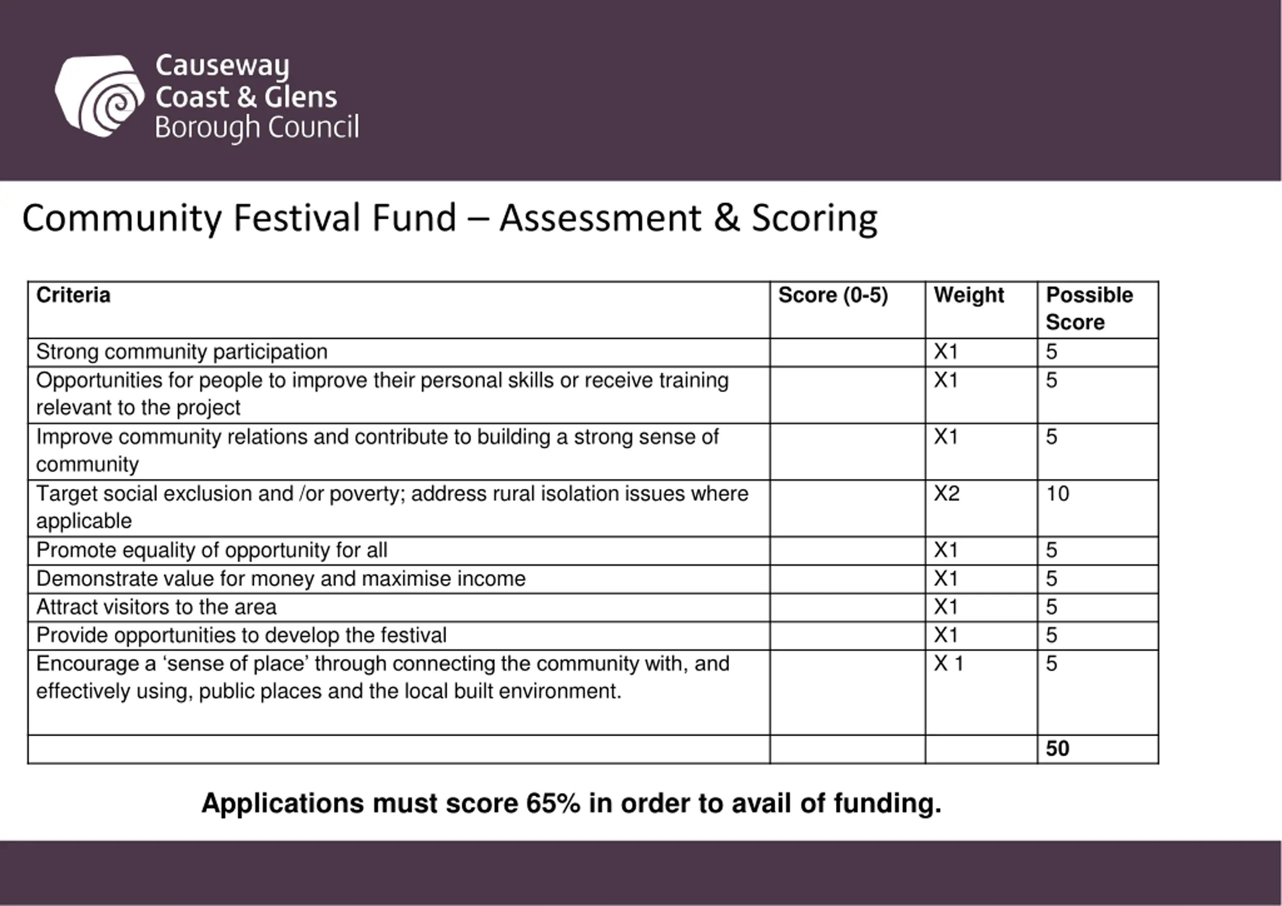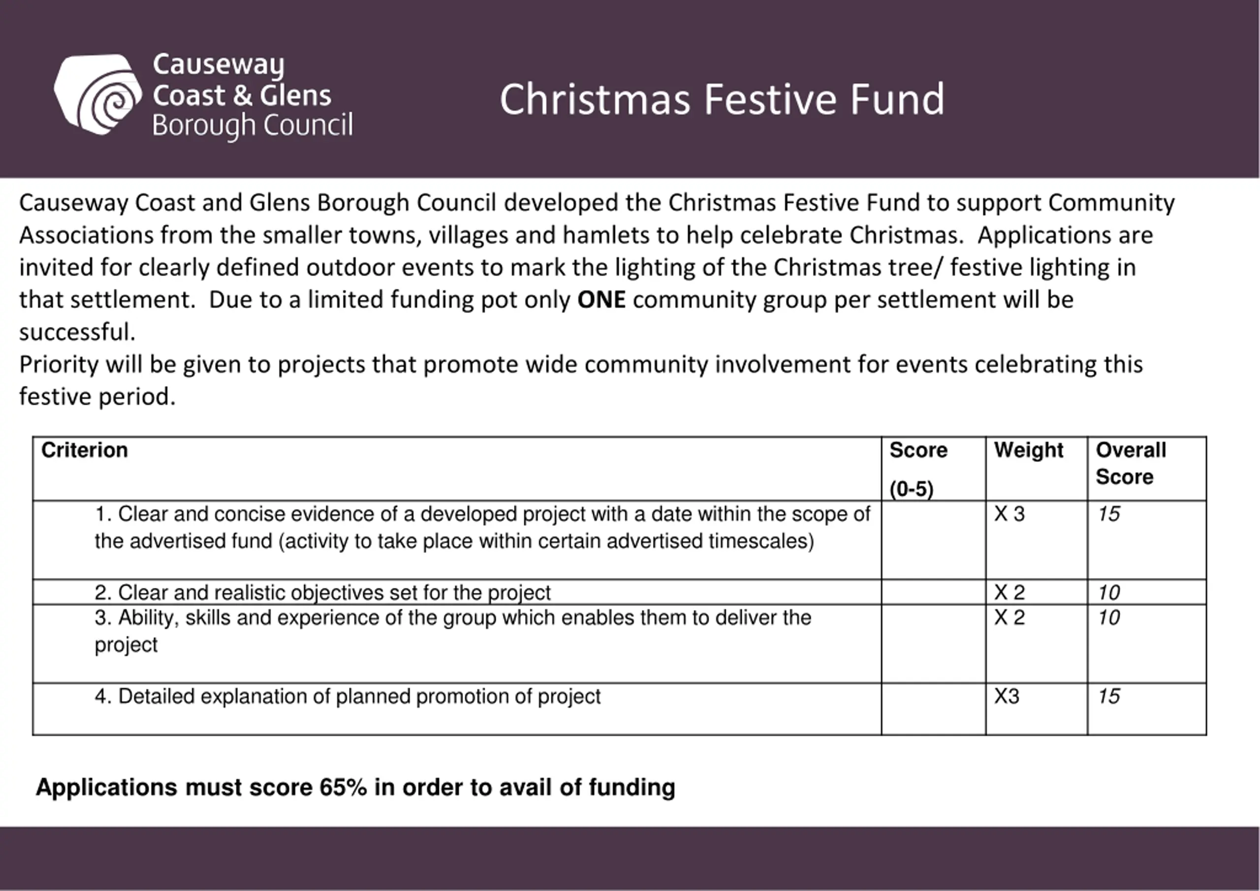 Christmas Festive Fund Causeway Coast and Glens Borough Council developed the Christmas Festive Fund to support Community Associations from the smaller towns, villages and hamlets to help celebrate Christmas.Applications are invited for clearly defined outdoor events to mark the lighting of the Christmas tree/ festive lighting in that settlement. Due to a limited funding pot only ONE community group per settlement will be successful. Priority will be given to projects that promote wide community involvement for events celebrating this festive period. Criterion Score Weight Overall Score (0-5) . 1. Clear and concise evidence of a developed project with a date within the scope of the advertised fund (activity to take place within certain advertised timescales) 2. Clear and realistic objectives set for the project 3. Ability, skills and experience of the group which enables them to deliver the project 4. Detailed explanation of planned promotion of project X 3 15 X 2 X 2 10 10 X3 15 Applications must score 65% in order to avail of funding