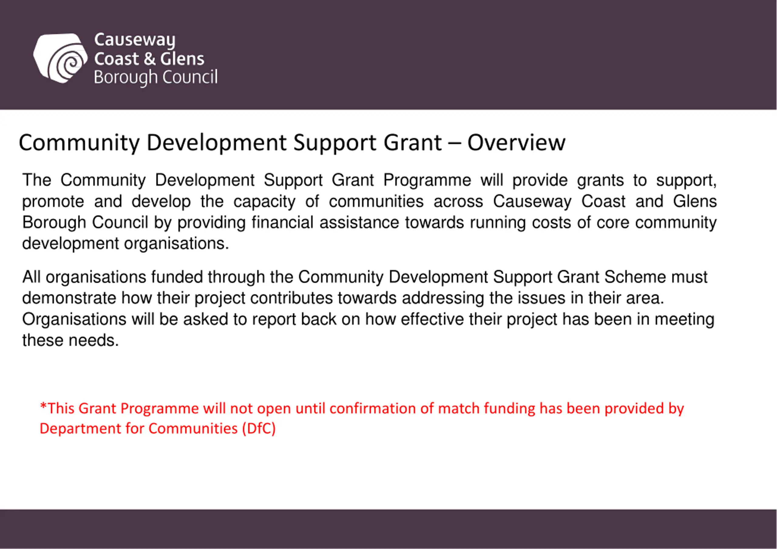 Community Development Support Grant Overview The Community Development Support Grant Programme will provide grants to support, promote and develop the capacity of communities across Causeway Coast and Glens Borough Council by providing financial assistance towards running costs of core community development organisations. All organisations funded through the Community Development Support Grant Scheme must demonstrate how their project contributes towards addressing the issues in their area. Organisations will be asked to report back on how effective their project has been in meeting these needs. *This Grant Programme will not open until confirmation of match funding has been provided by Department for Communities (DfC)