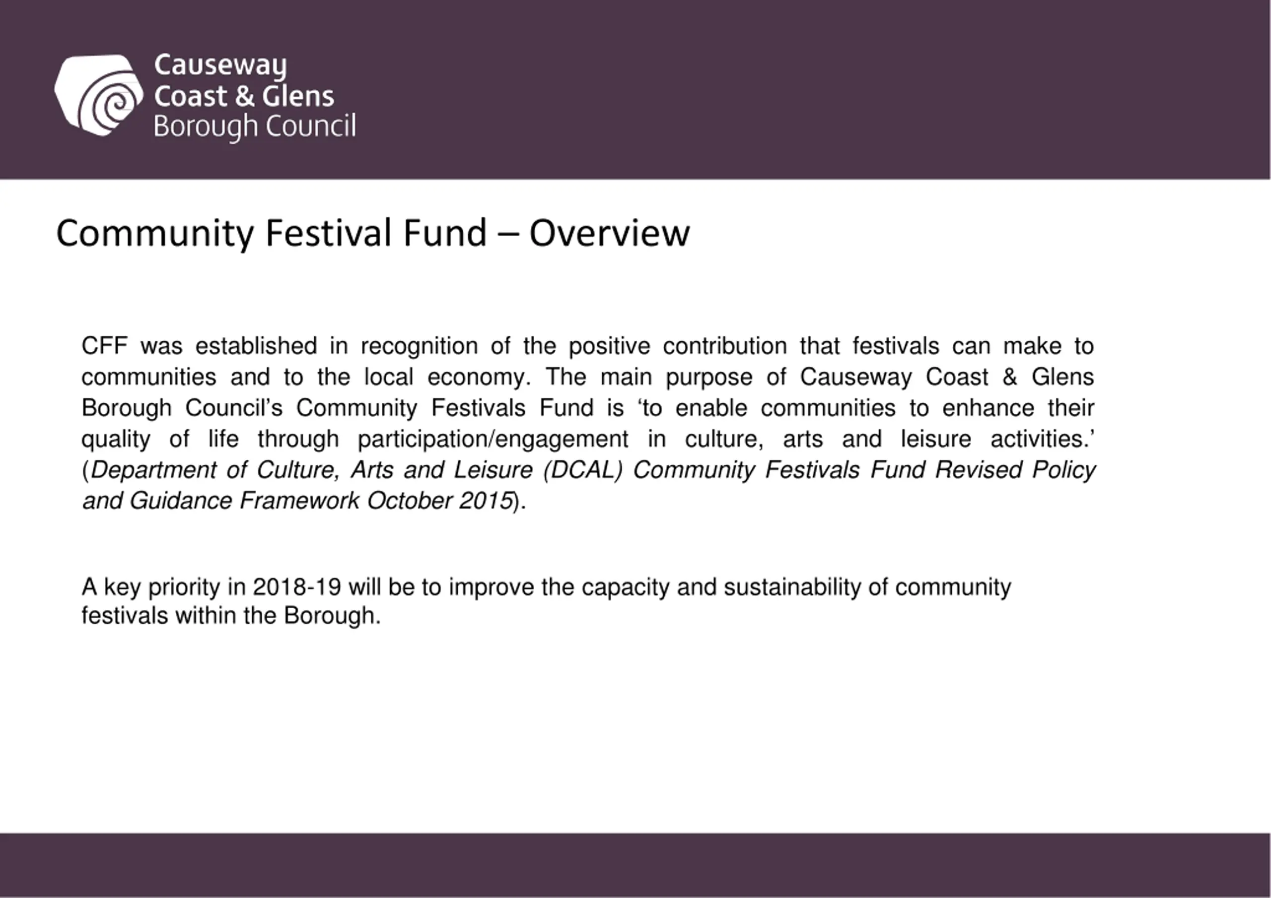 Community Festival Fund Overview CFF was established in recognition of the positive contribution that festivals can make to communities and to the local economy. The main purpose of Causeway Coast & Glens Borough Council s Community Festivals Fund is to enable communities to enhance their quality of life through participation/engagement in culture, arts and leisure activities. (Department of Culture, Arts and Leisure (DCAL) Community Festivals Fund Revised Policy and Guidance Framework October 2015). A key priority in 2018-19 will be to improve the capacity and sustainability of community festivals within the Borough.